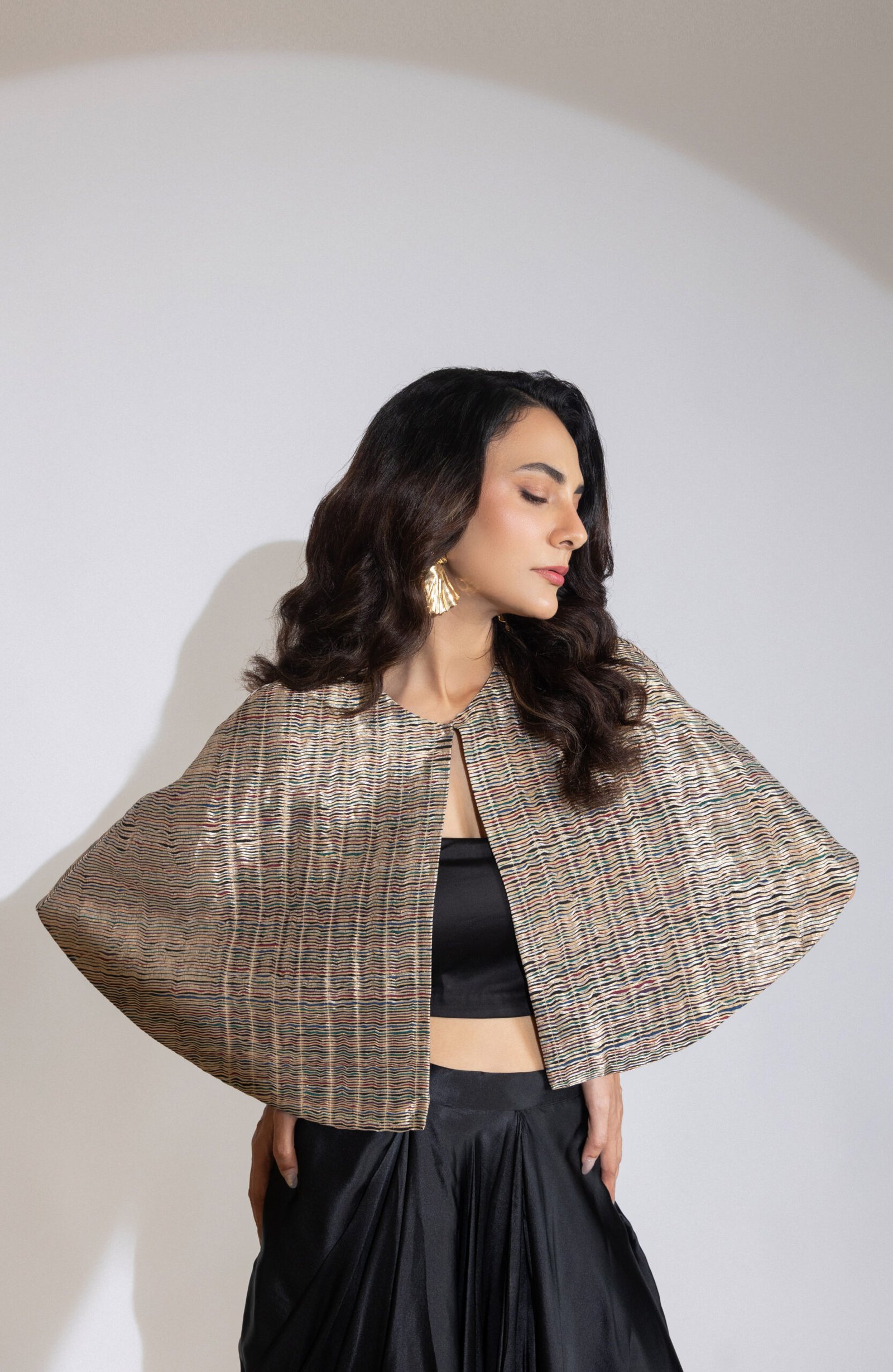 This Handwoven cape jacket is crafted in cotton-silk with metallic handloom stripes. The open