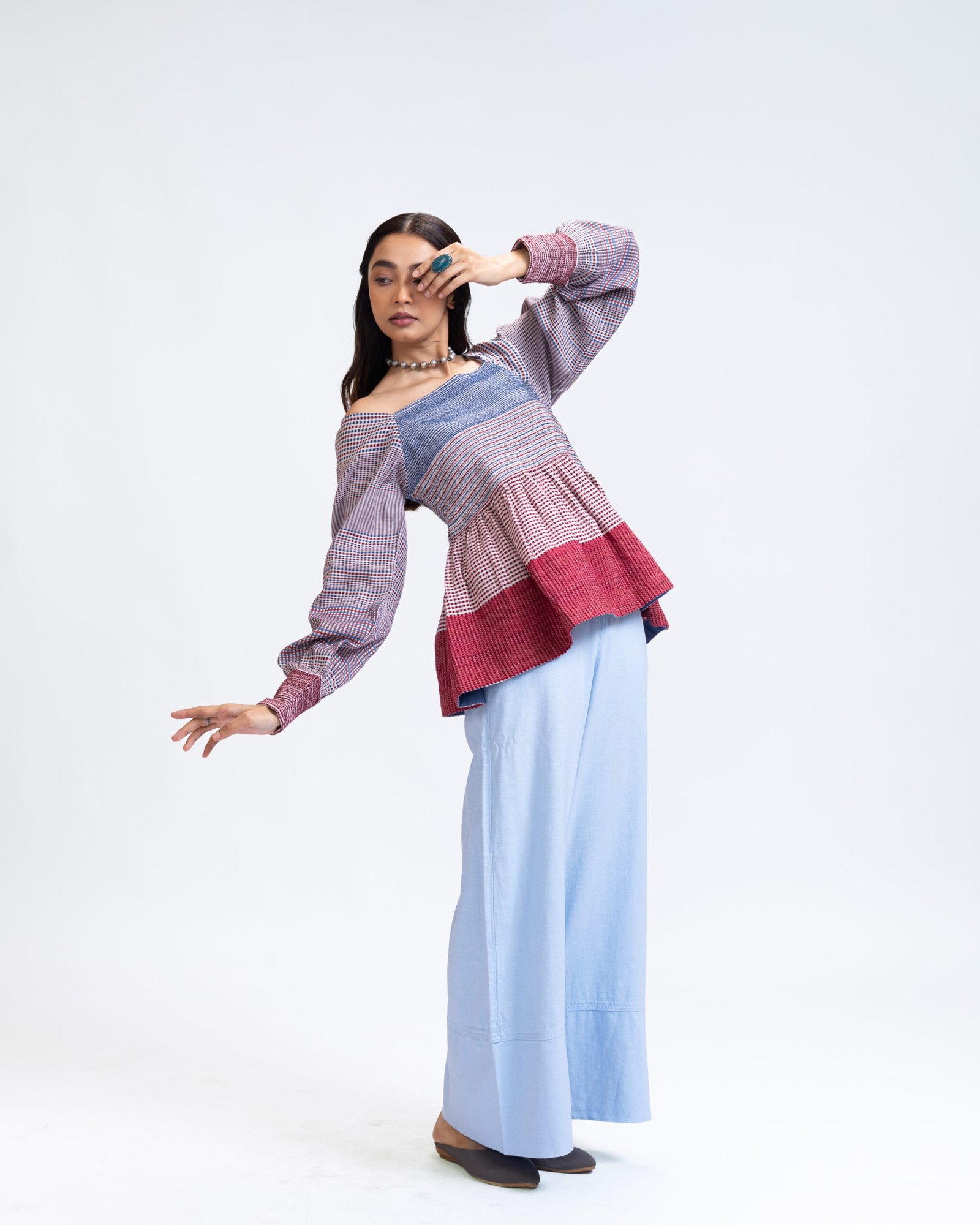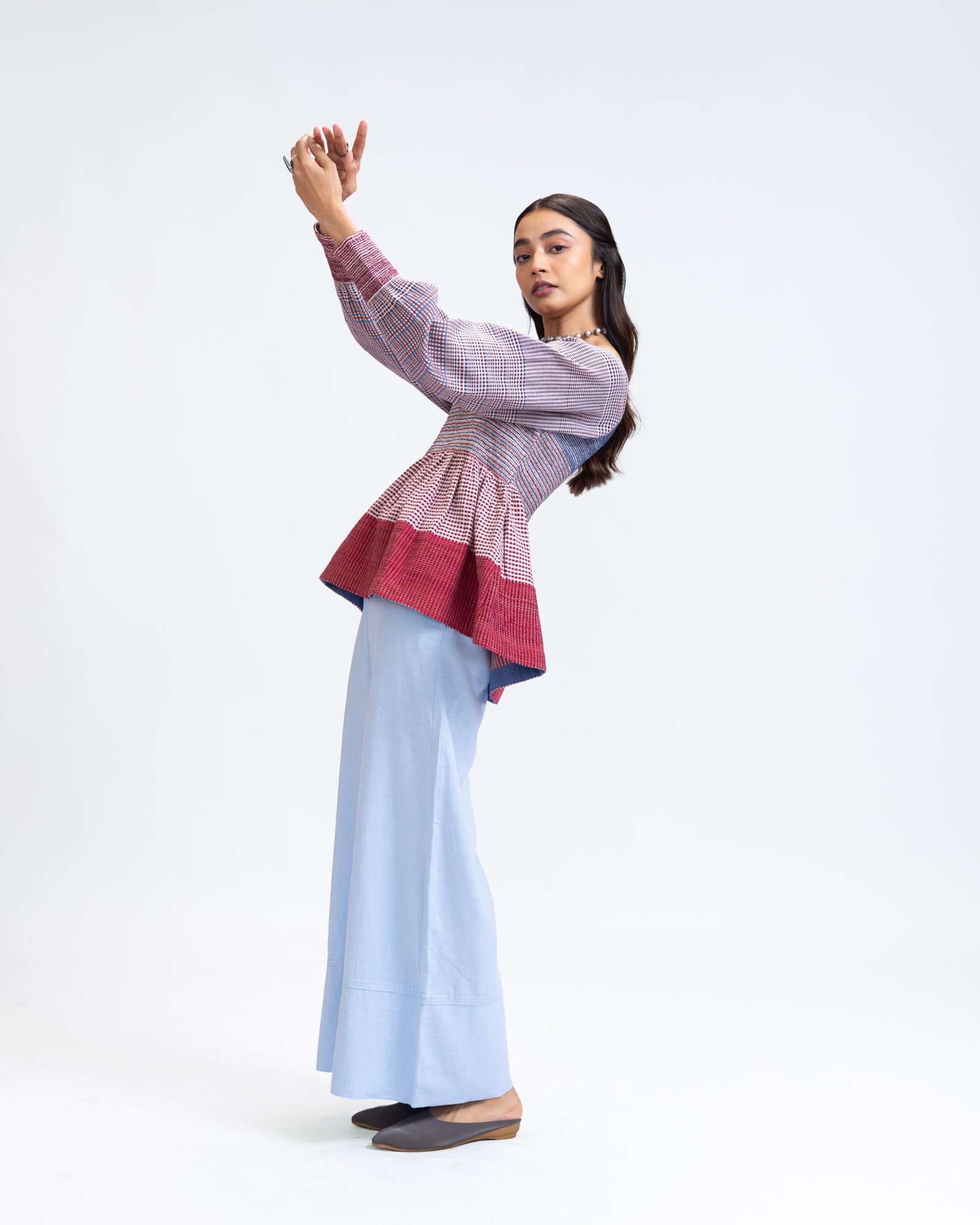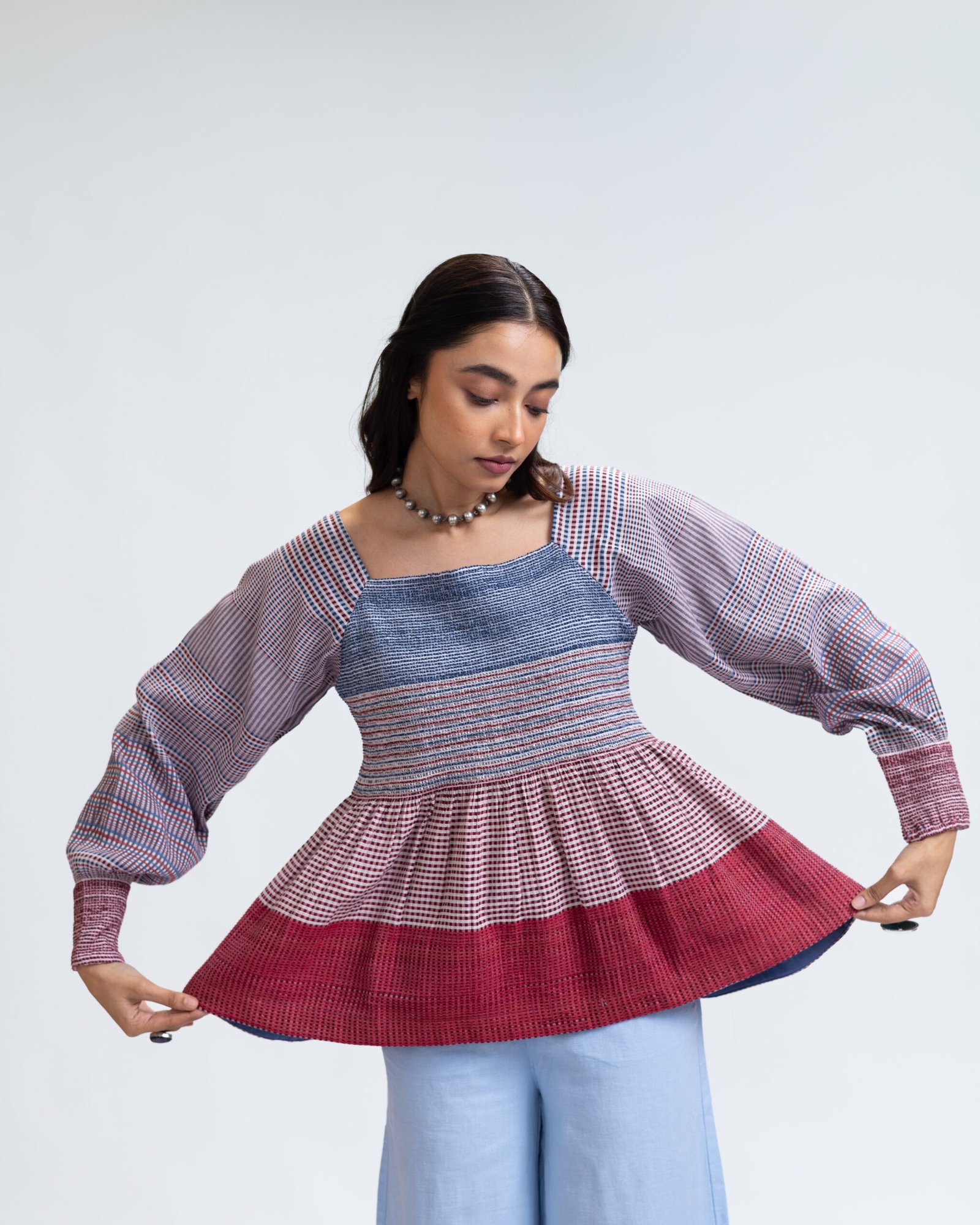 ₹14,200.00This ready to wear peplum top has been designed with cotton, silk and lycra. This is a one-piece woven garment not cut and sewn which makes it truly unique. The square neckline, full sleeves that are relaxed and some waist cinching that flares out for an easy fit.