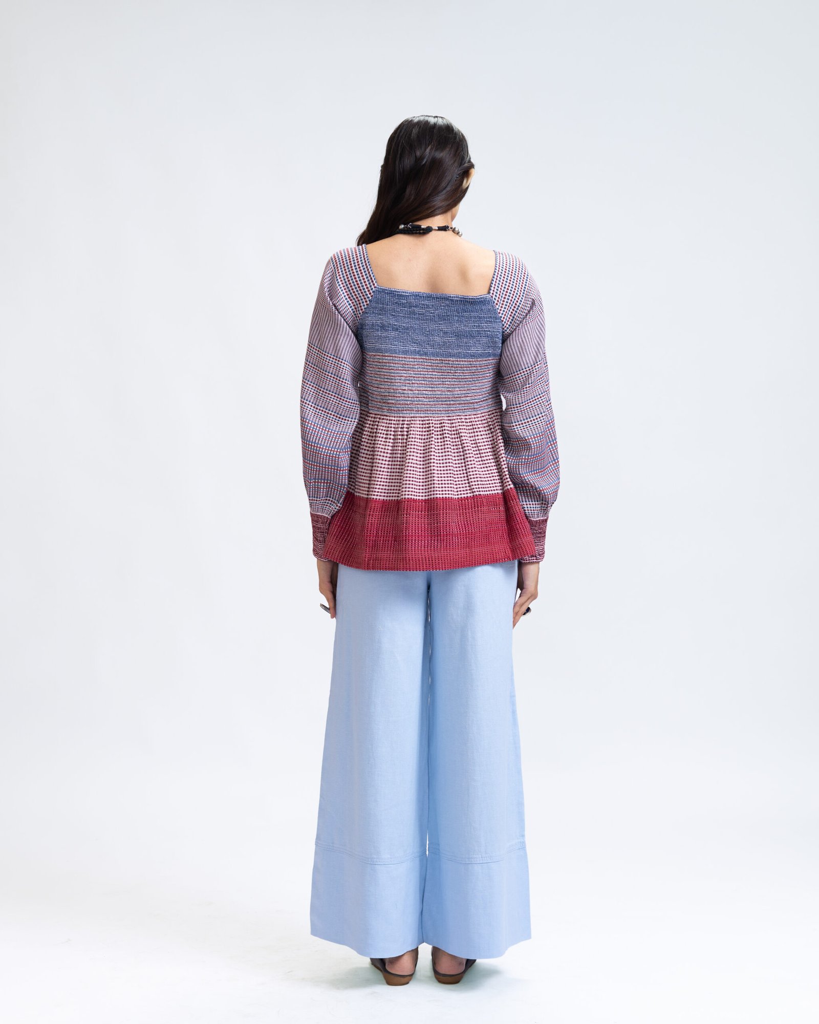 This ready to wear peplum top has been designed with cotton, silk and lycra. This is a one-piece woven garment not cut and sewn which makes it truly unique. The square neckline, full sleeves that are relaxed and some waist cinching that flares out for an easy fit.