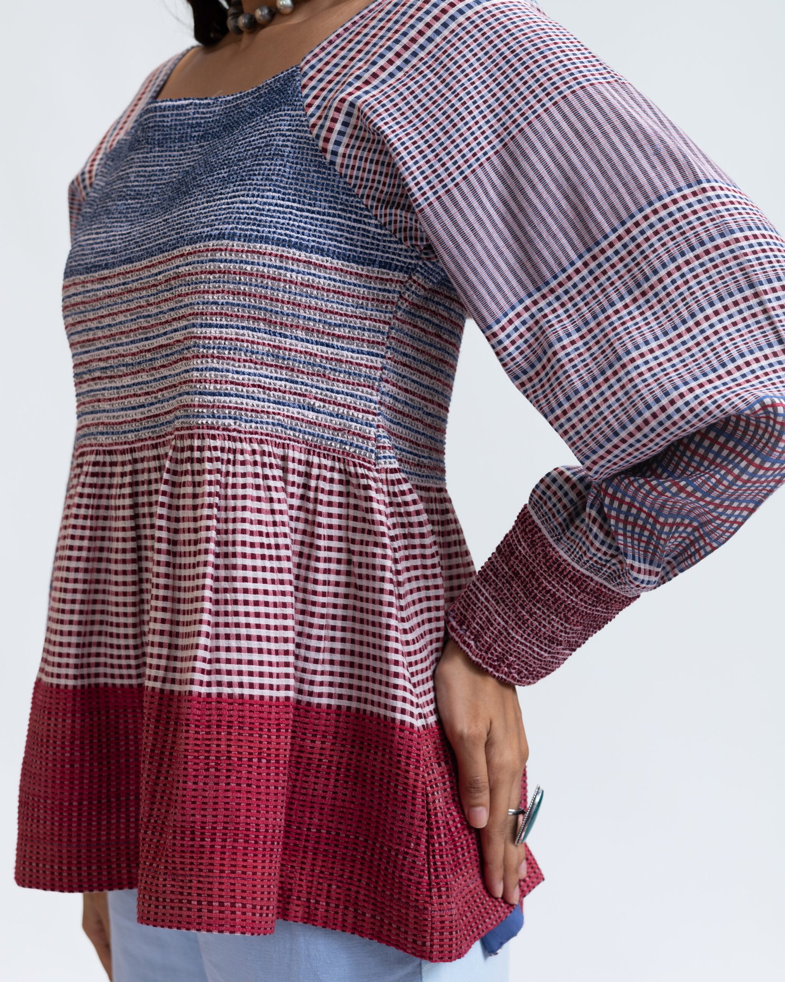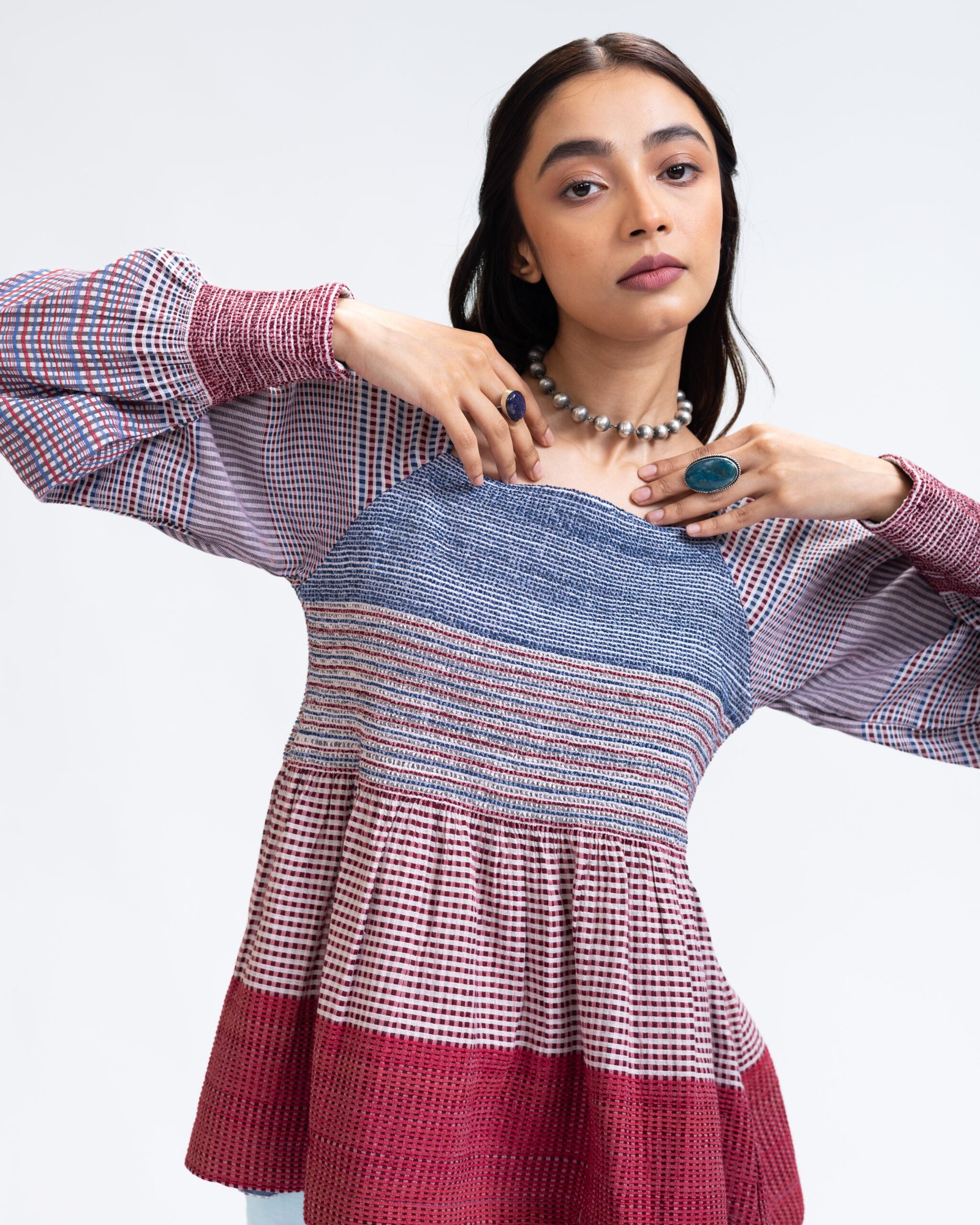 ₹13,200.00A short ready to wear tunic dress woven in multiple different design panels in maroon, blush and checkered white, cut separately and attached vertically. It has full sleeves with light blue cuffs and a round neckline. The fit is straight and relaxed, suitable for daily wear.
