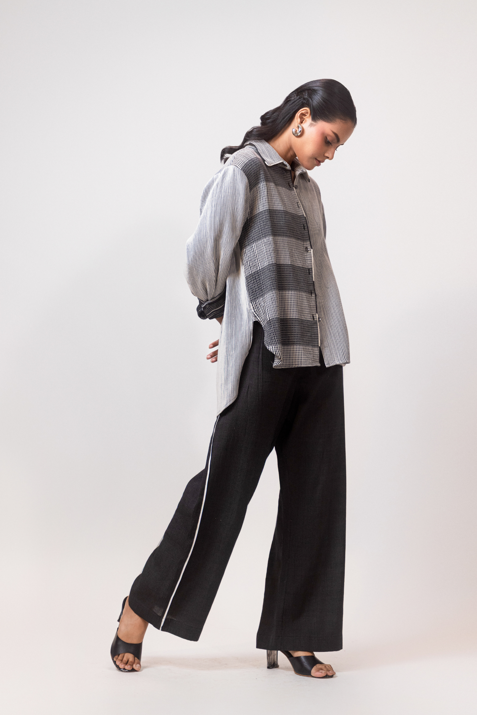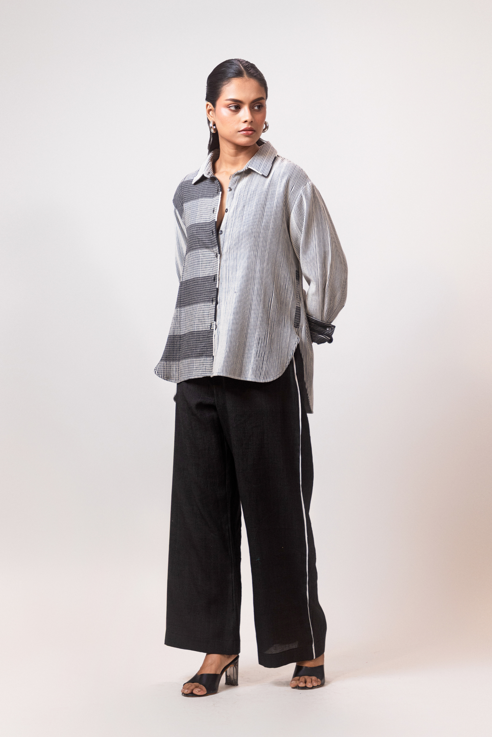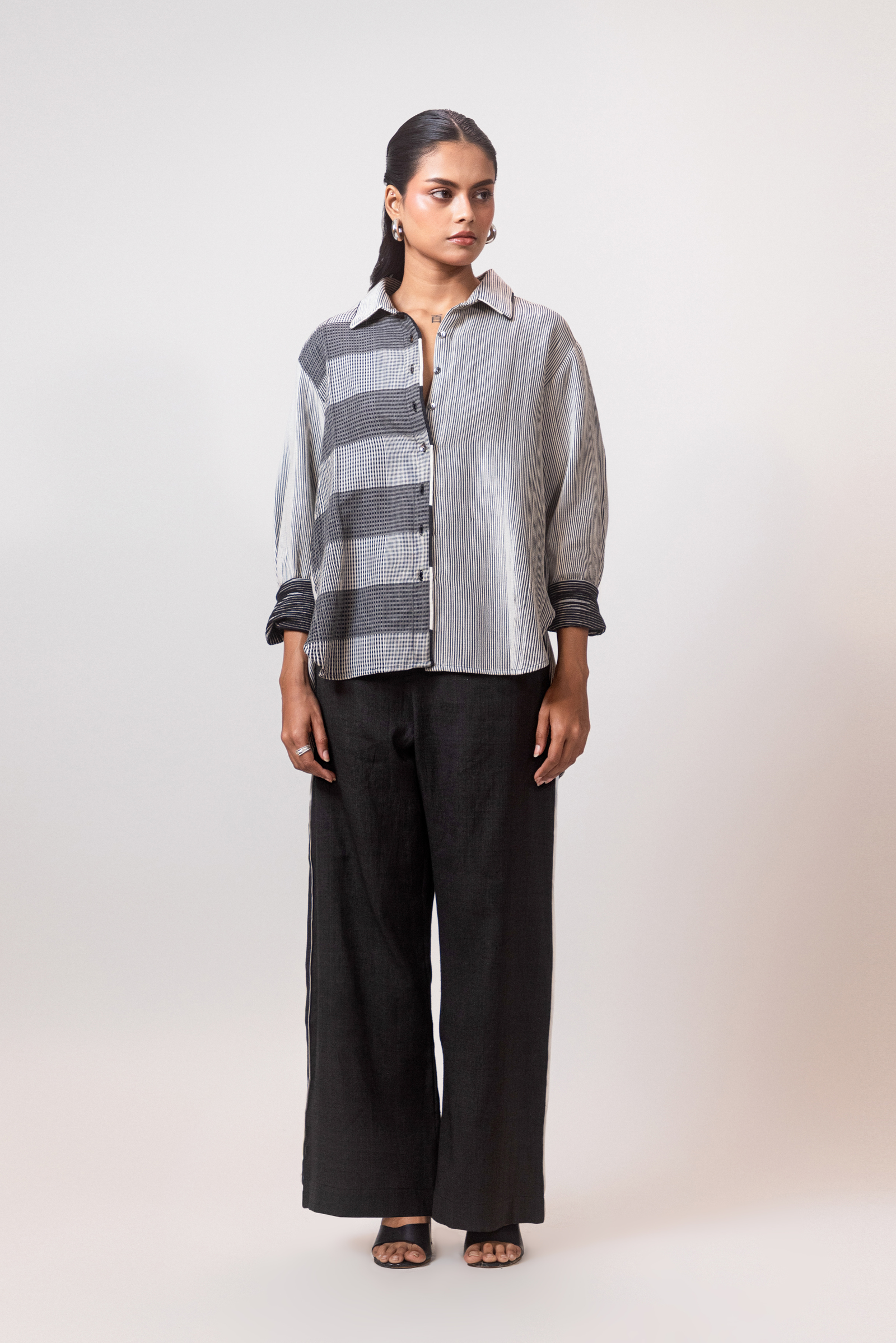 A relaxed-fit ready to wear shirt made in a blend of black and white texture. The customised panel is woven separately. Features long sleeves, a clean silhouette, and subtle texture detailing. Easy to pair and comfortable for everyday wear.