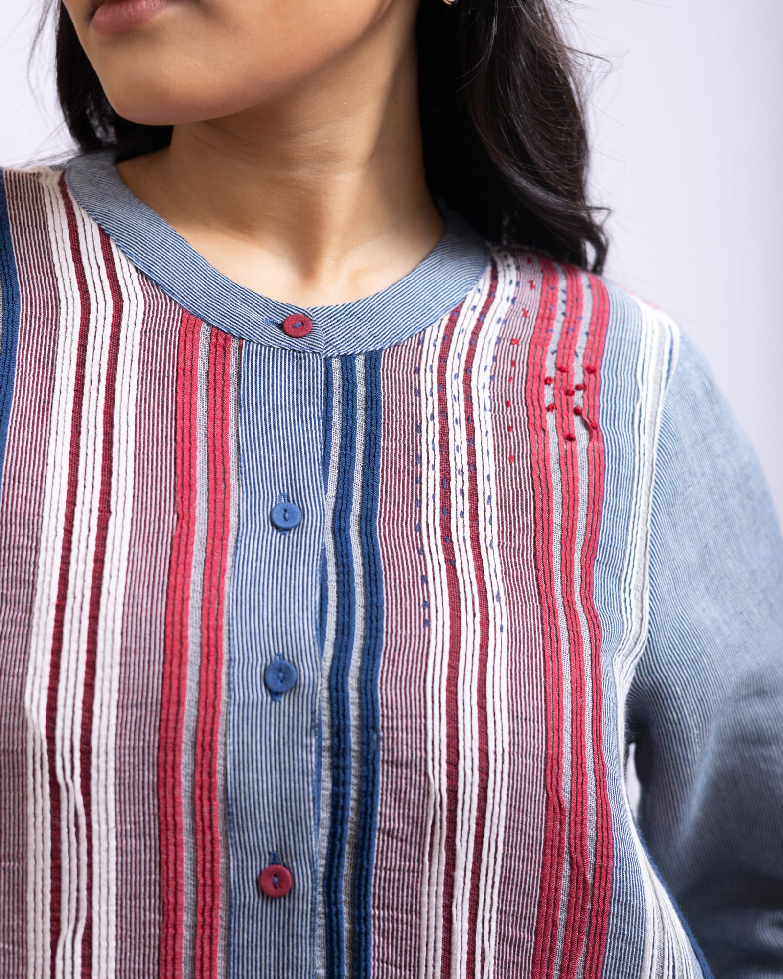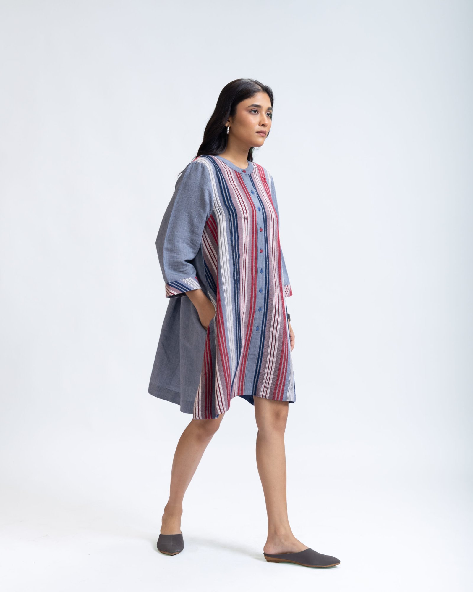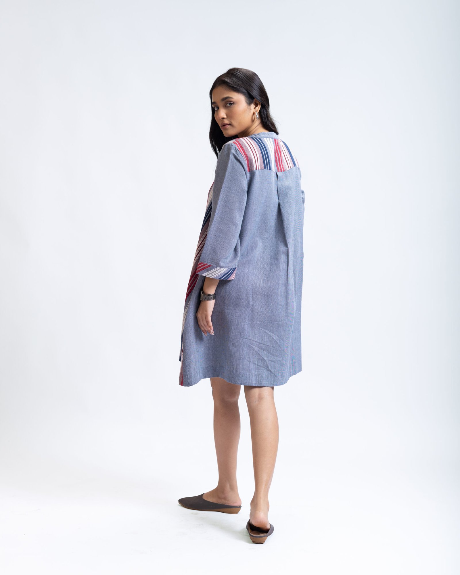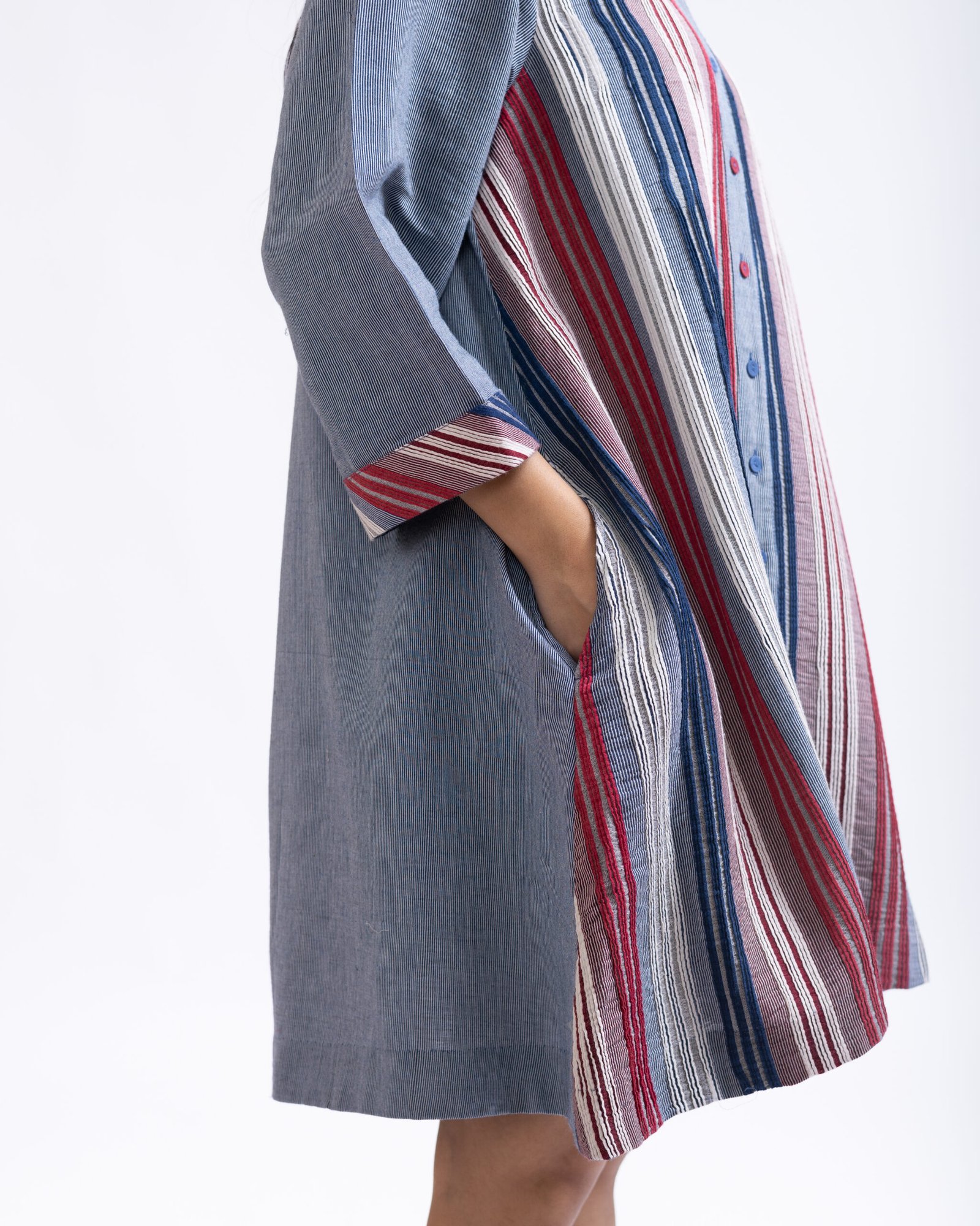 ₹9,000.00A relaxed-fit ready to wear midi dress featuring bold, multi-directional stripes on a soft blue base. The asymmetrical panelling and round neckline give it a modern twist, there is red kantha and cross stitch detailing across the piece.