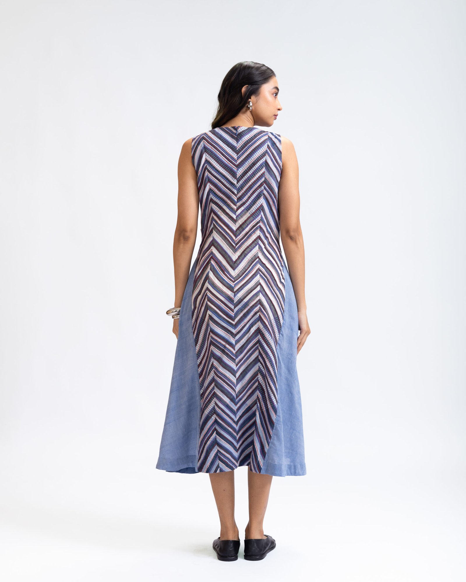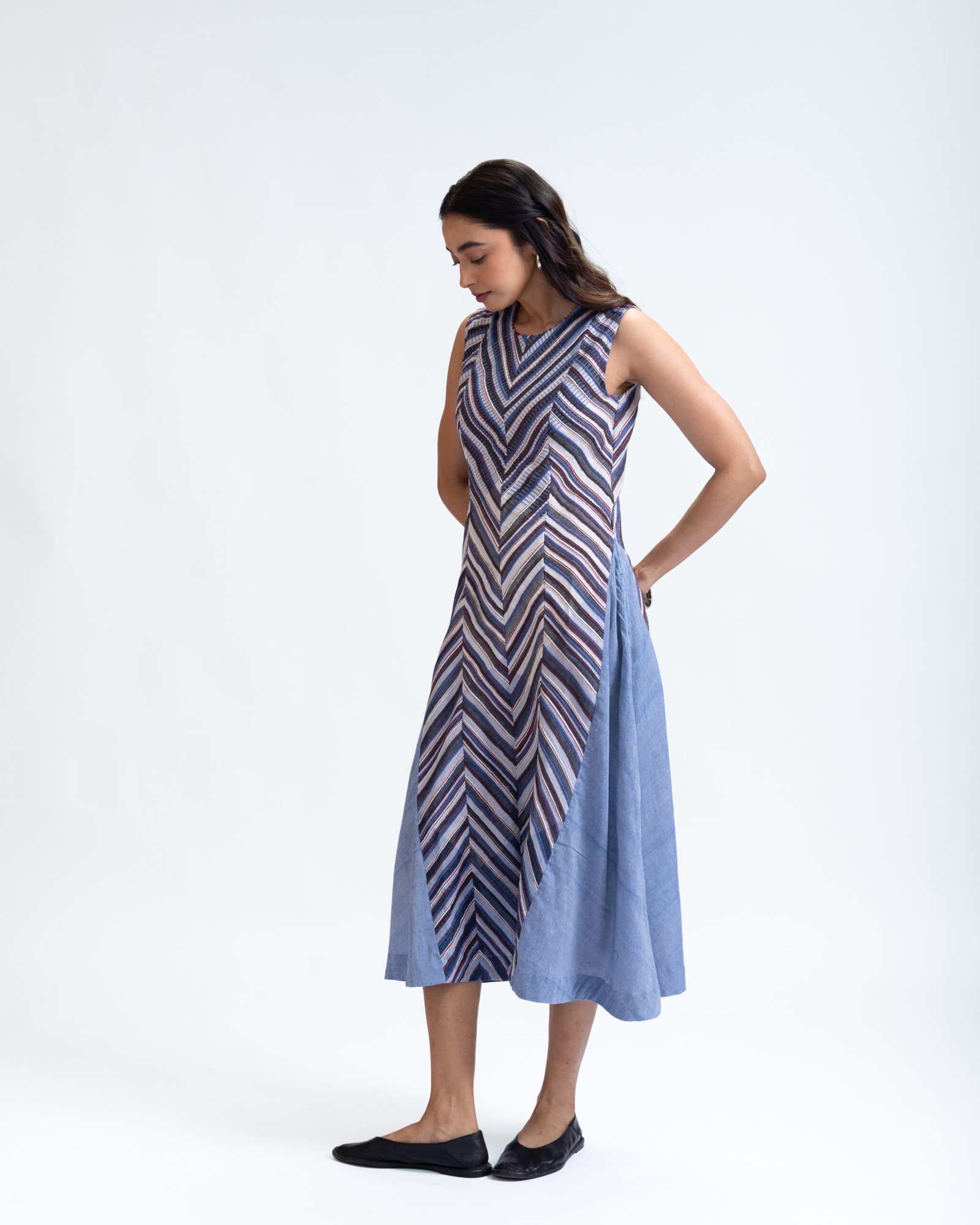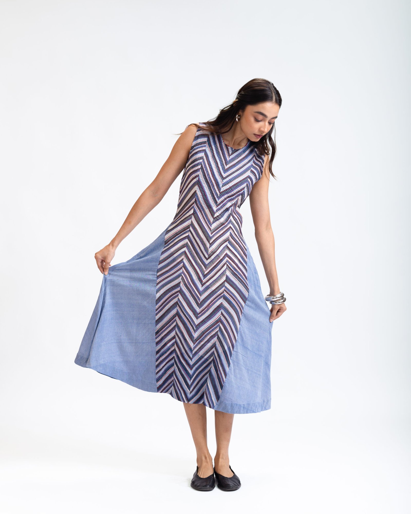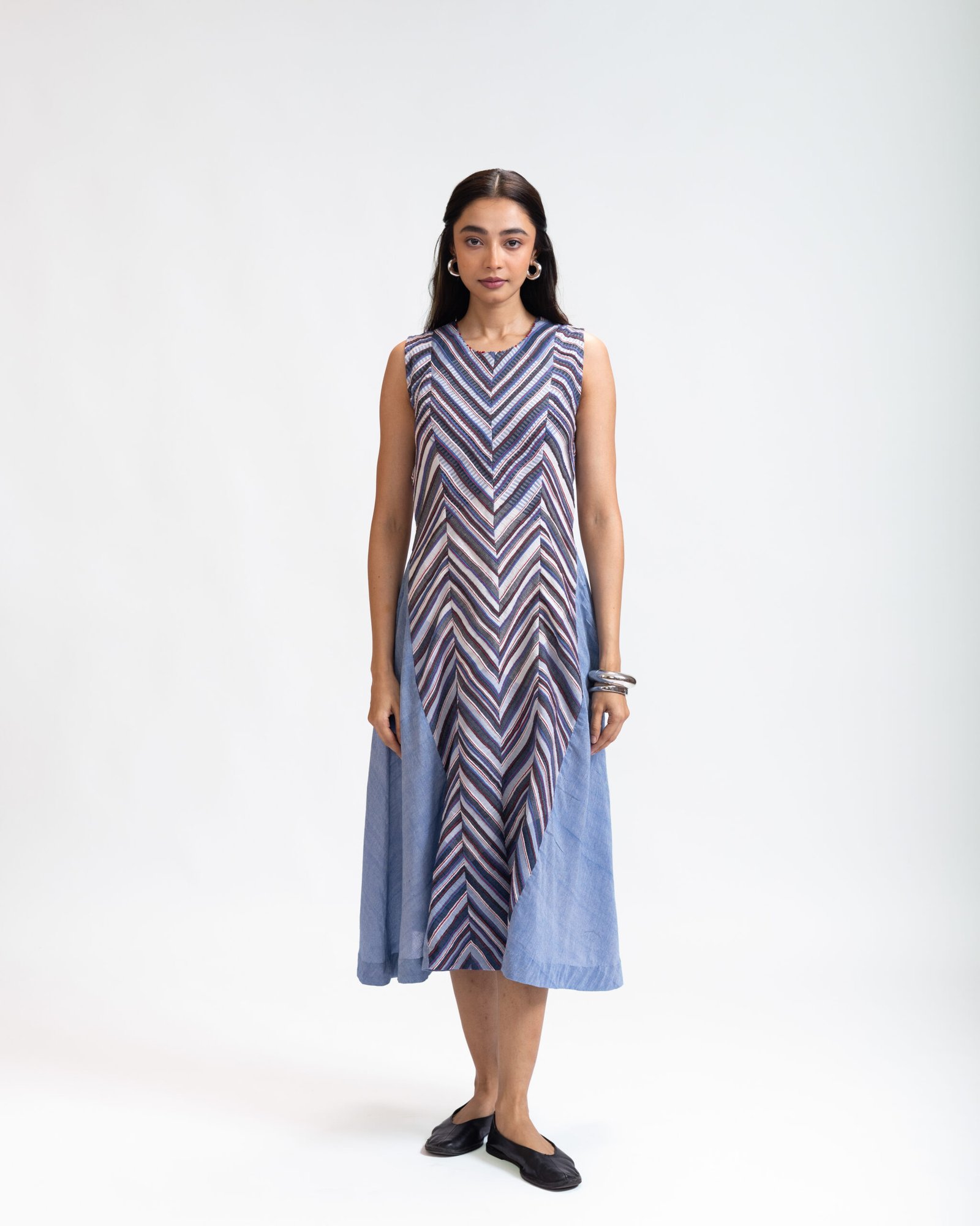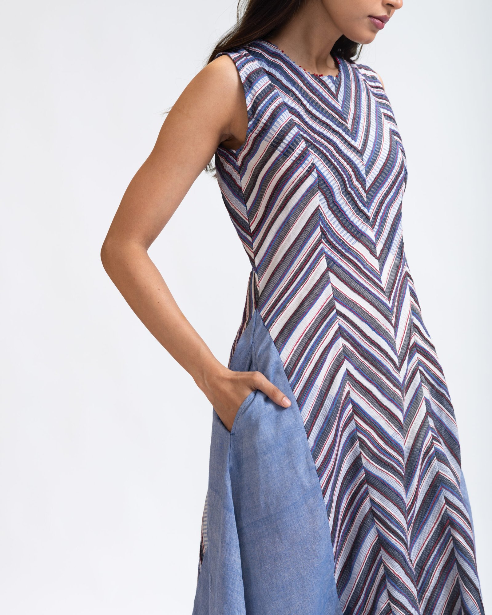 ₹9,000.00A relaxed-fit ready to wear midi dress featuring bold, multi-directional stripes on a soft blue base. The asymmetrical panelling and round neckline give it a modern twist, there is red kantha and cross stitch detailing across the piece.