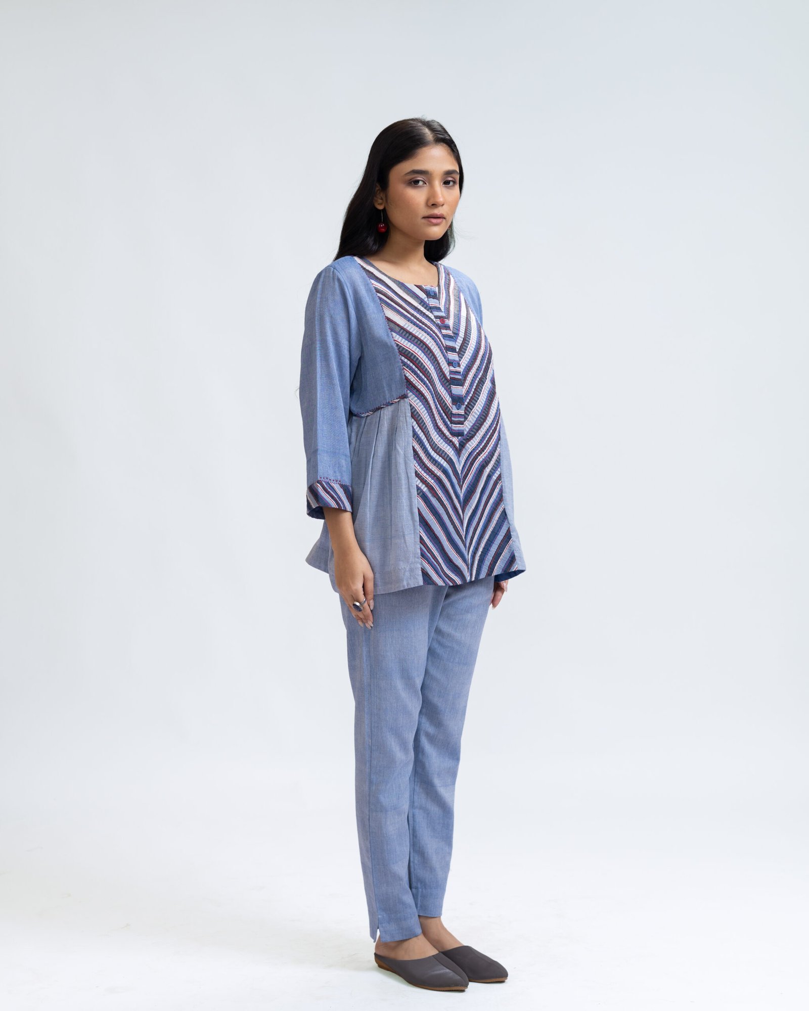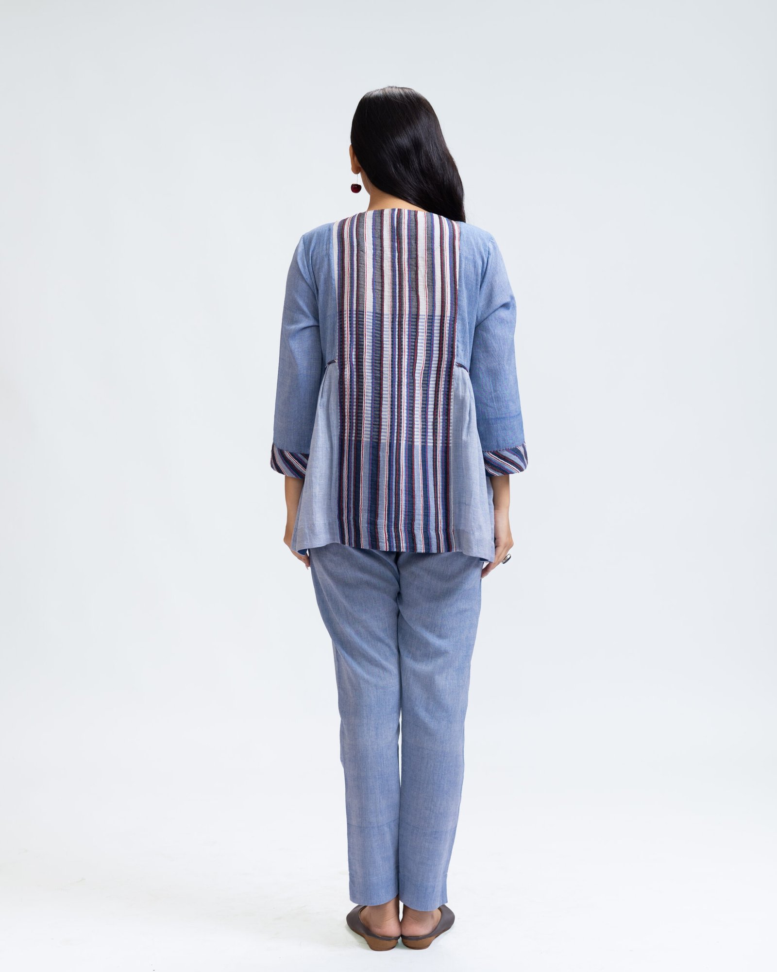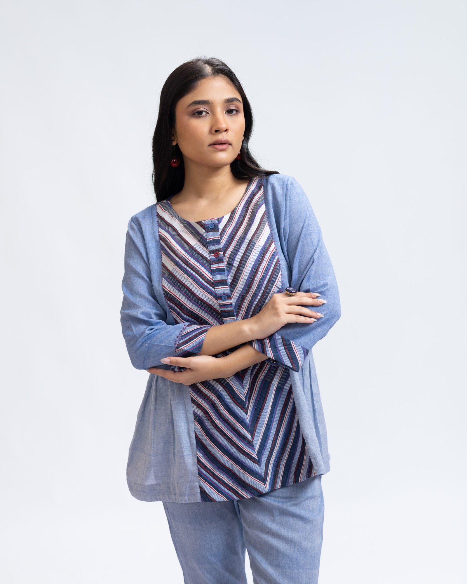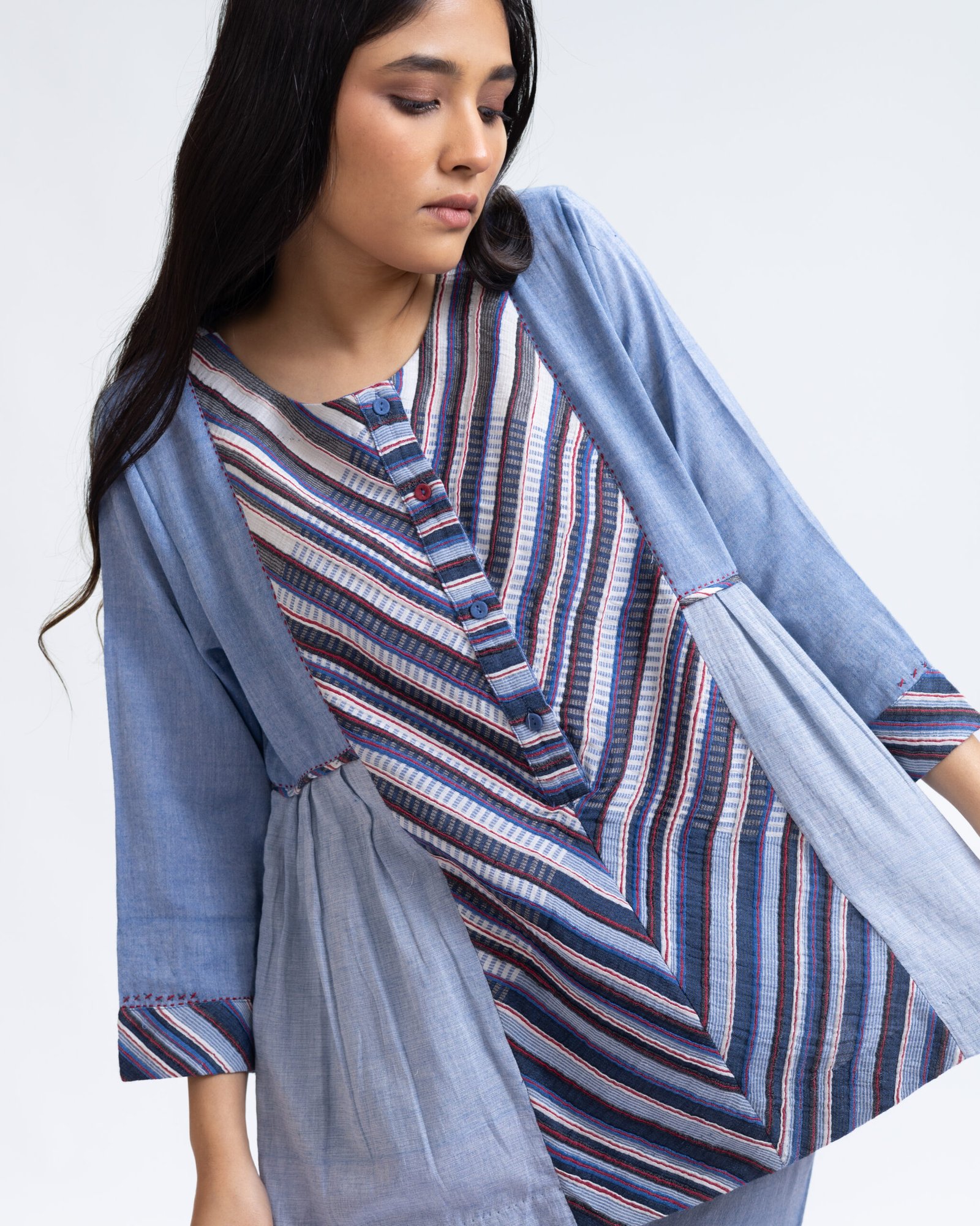 ₹9,000.00A relaxed-fit ready to wear midi dress featuring bold, multi-directional stripes on a soft blue base. The asymmetrical panelling and round neckline give it a modern twist, there is red kantha and cross stitch detailing across the piece.