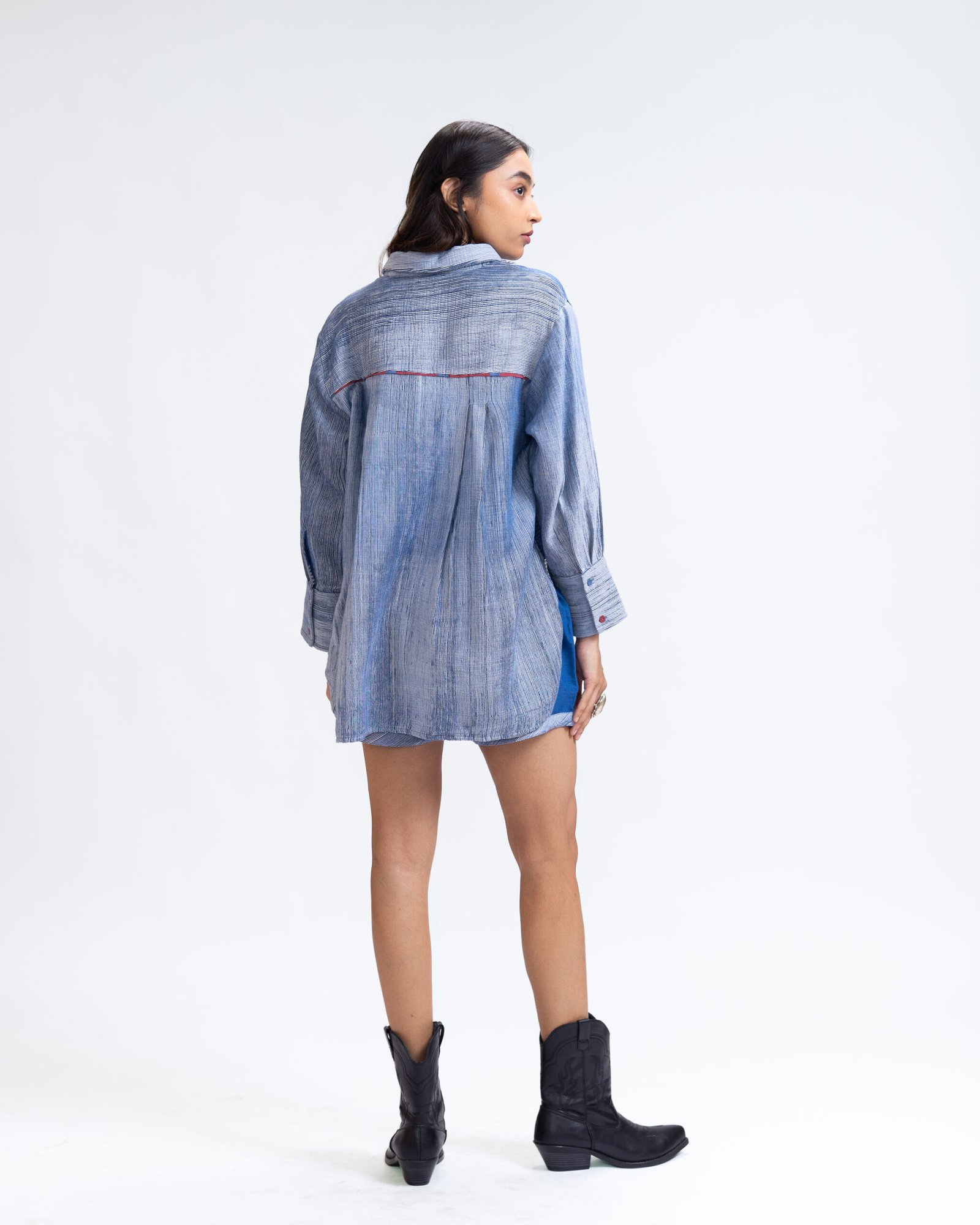 ₹12,500.00This ready to wear chic mini dress features wide flared sleeves and a relaxed A-line fit, offering both comfort and style. Designed using lycra in soft blue tones with bold stripe accents. This is a one-piece woven garment not cut and sewn which makes it truly unique.