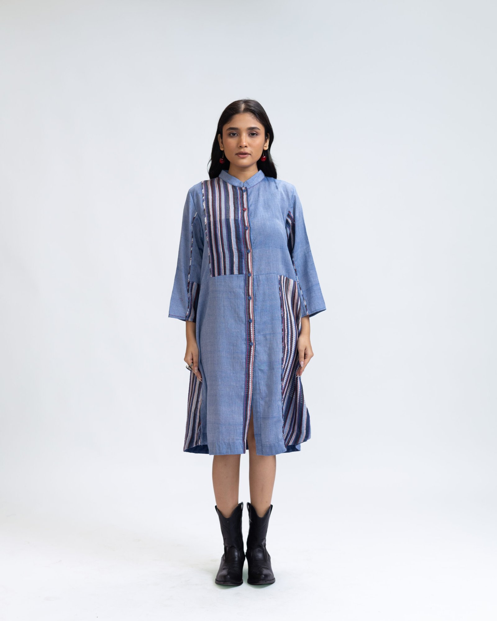 ₹9,000.00A relaxed-fit ready to wear midi dress featuring bold, multi-directional stripes on a soft blue base. The asymmetrical panelling and round neckline give it a modern twist, there is red kantha and cross stitch detailing across the piece.