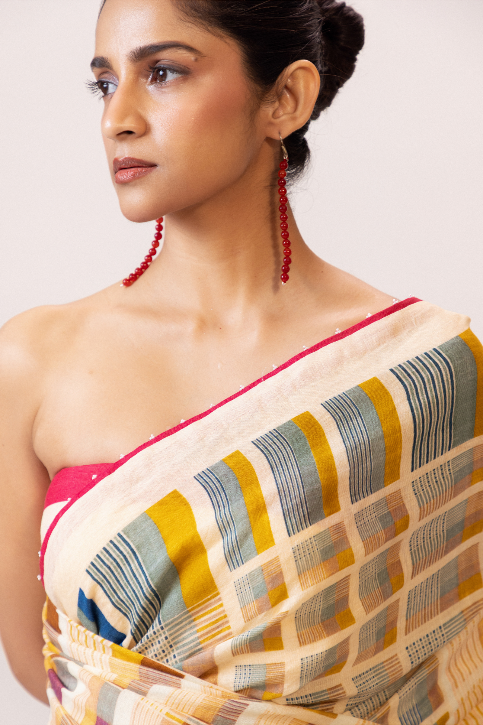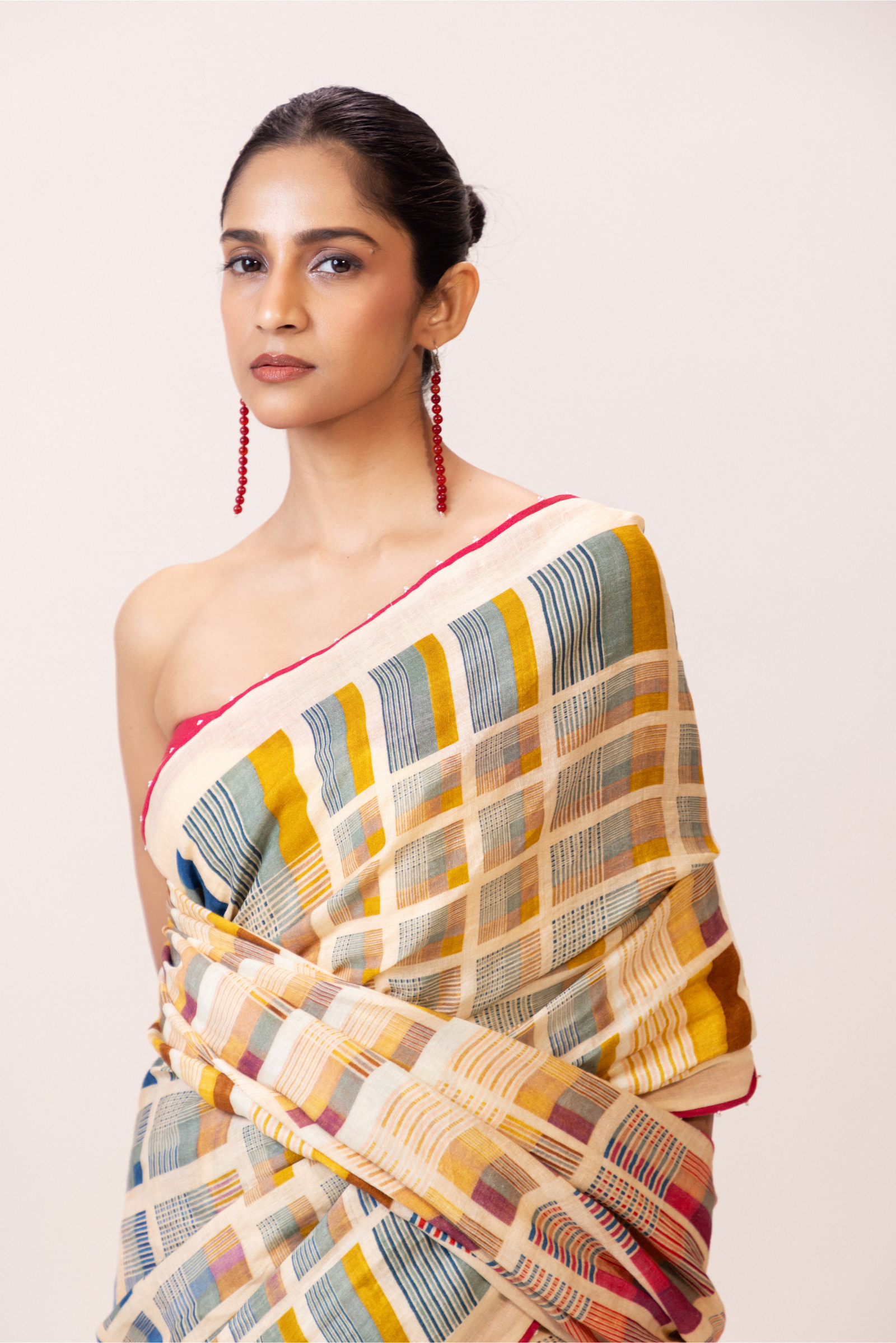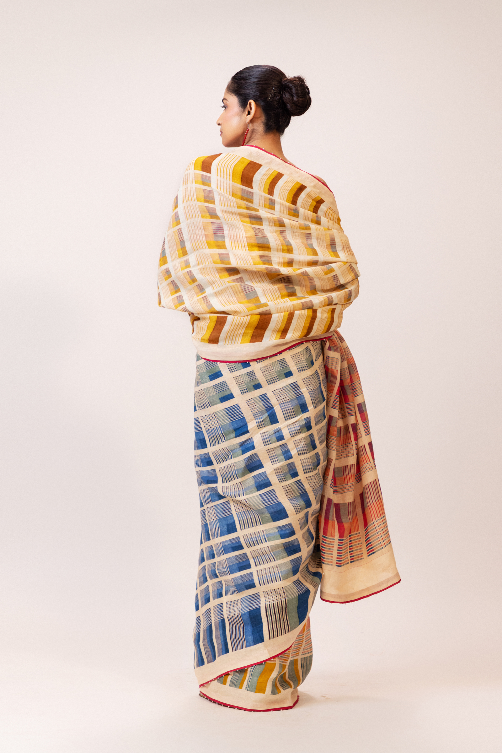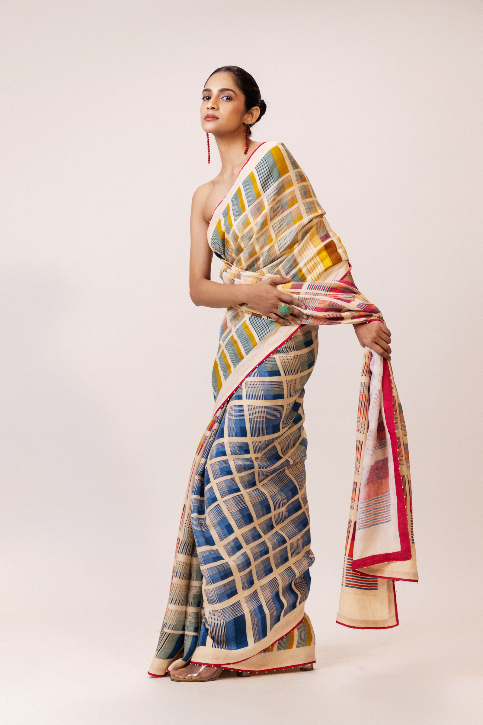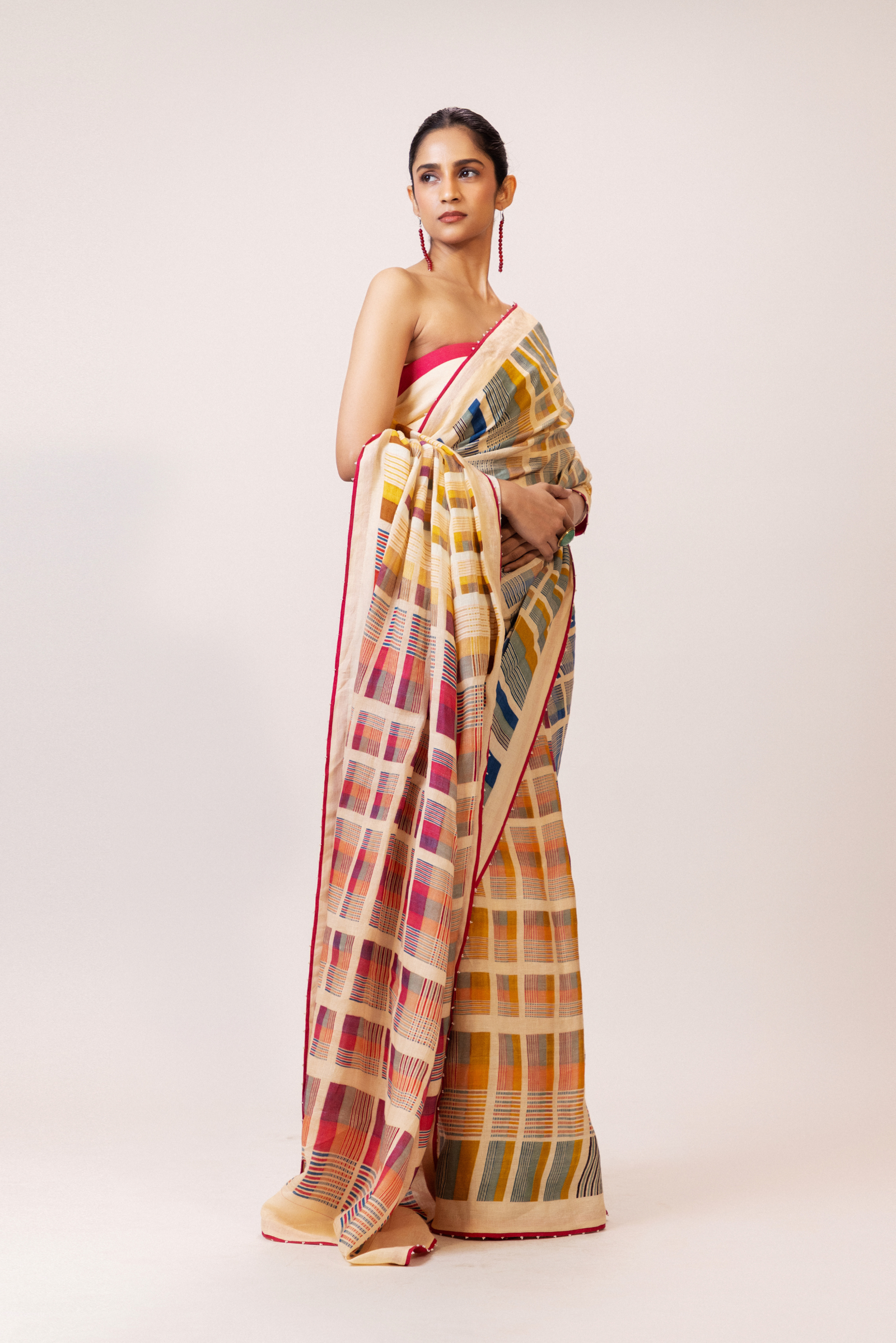 A refined interplay of geometry and colour, this 100% linen saree features multicoloured grid motifs across a soft ivory base. Finished with a striking crimson selvedge and along with delicate beadwork detailing.