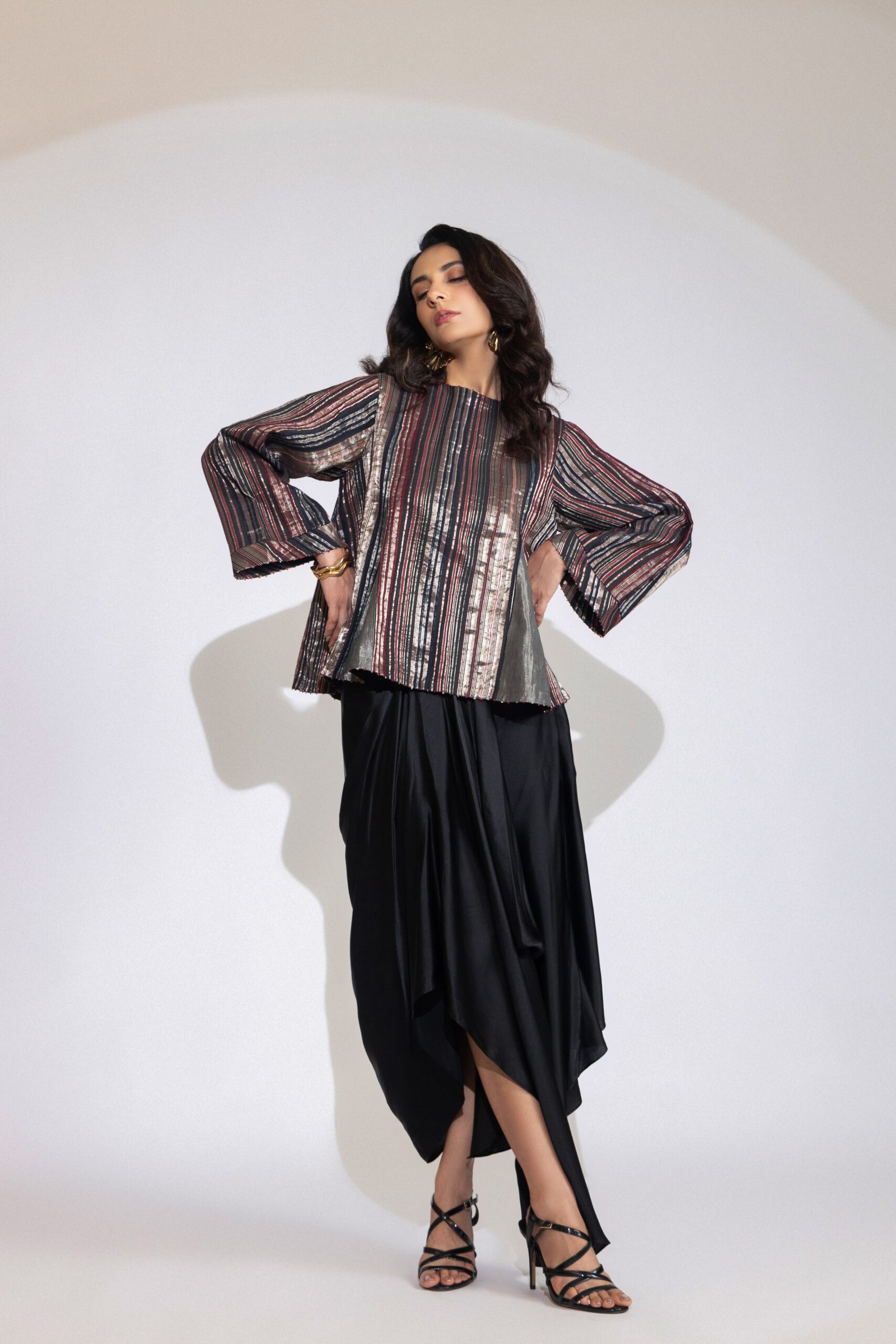 This cotton-silk top is handwoven with metallic stripes in black, Navy, silver, and Maroon . The
