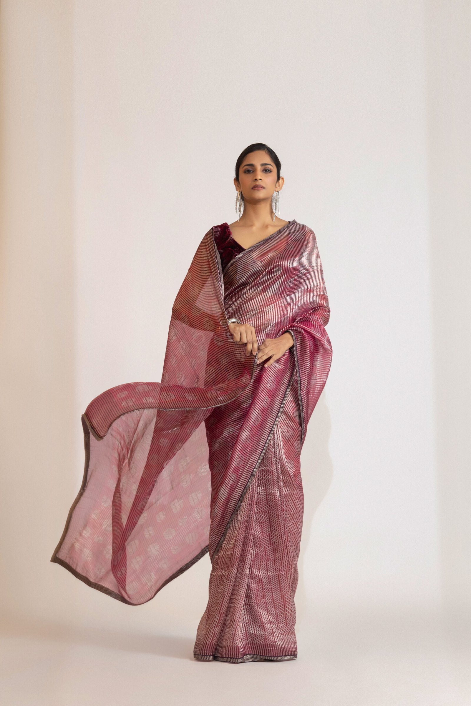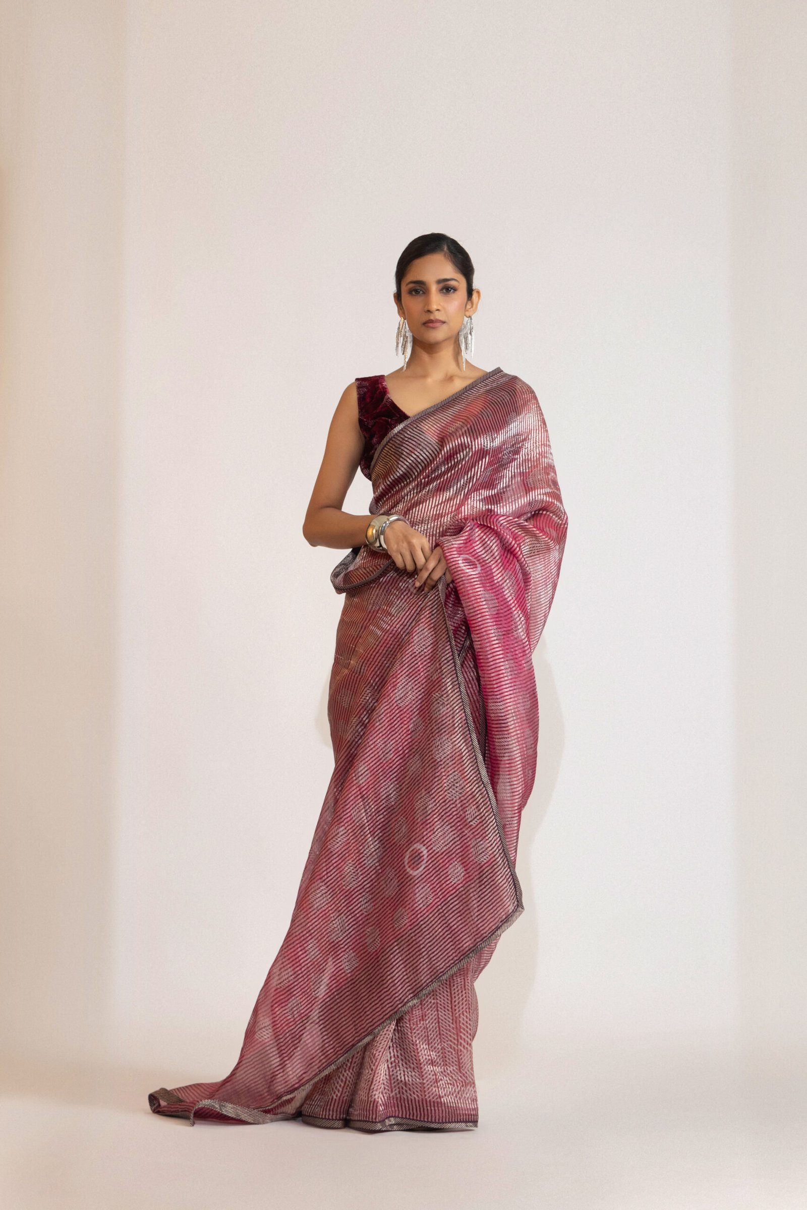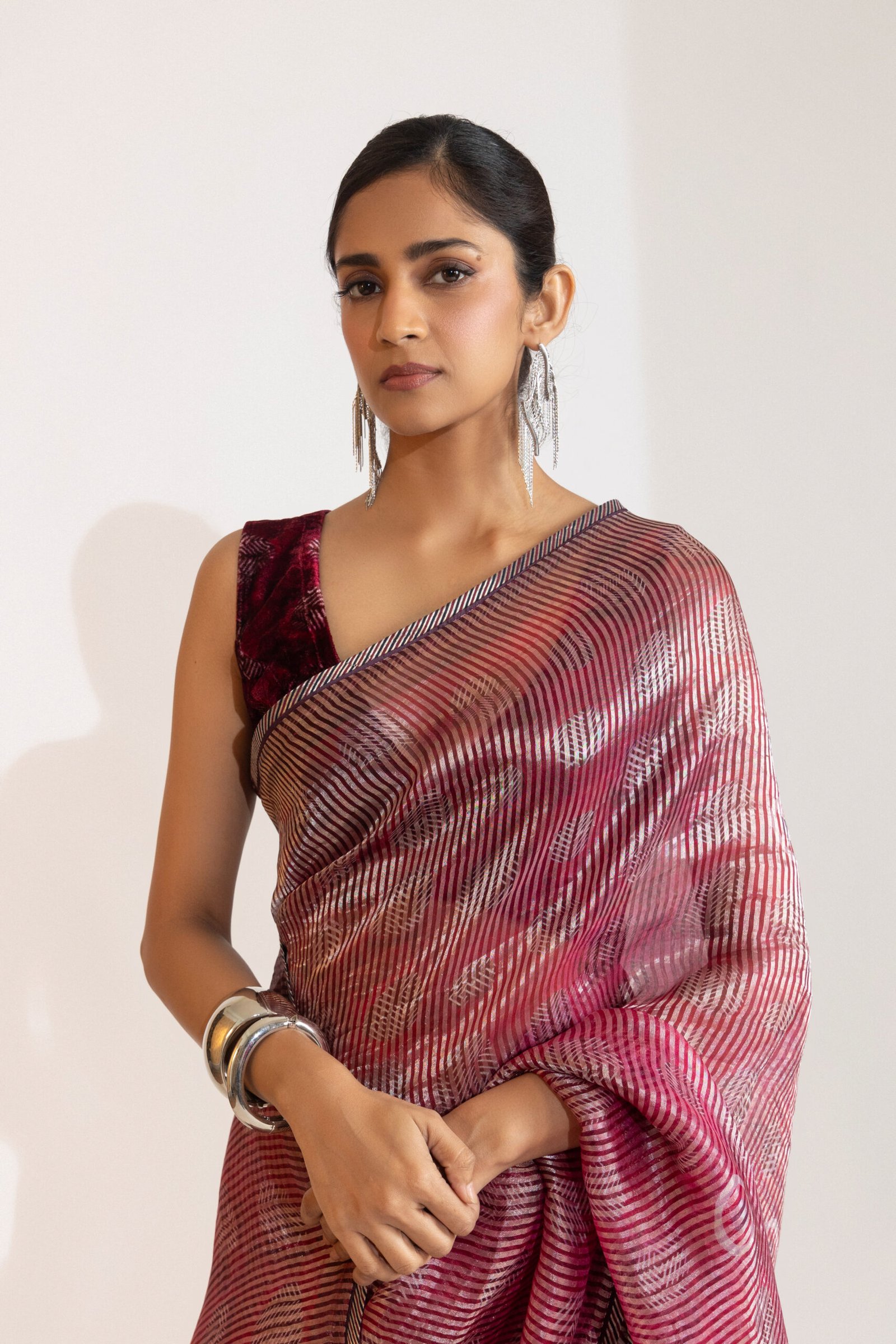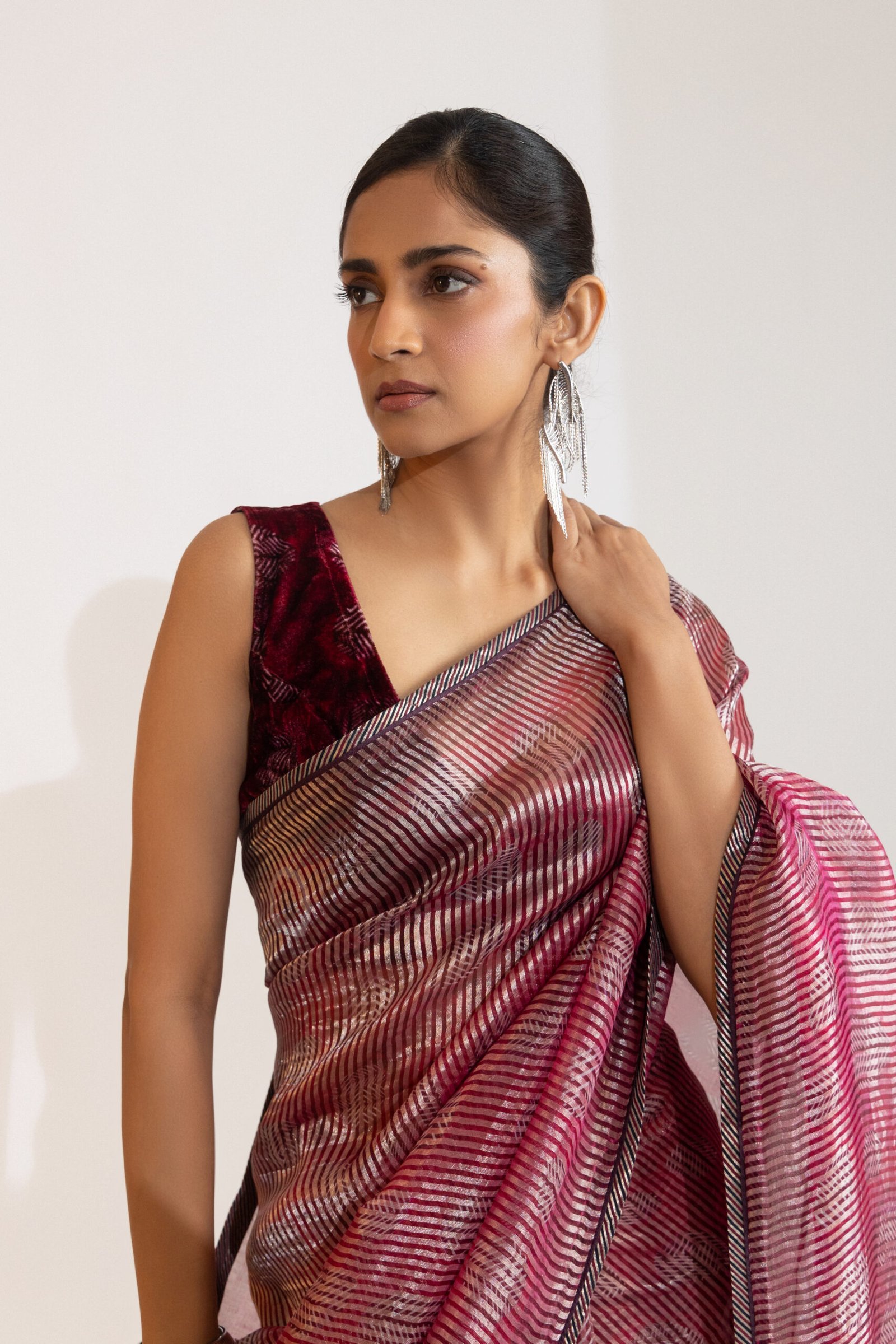 A silk saree in maroon and rose shades, woven with zari diagonal stripes. Leaf motifs shimmer across the surface in lines, giving it texture. A dark handwoven border provides balance to the luminous base.