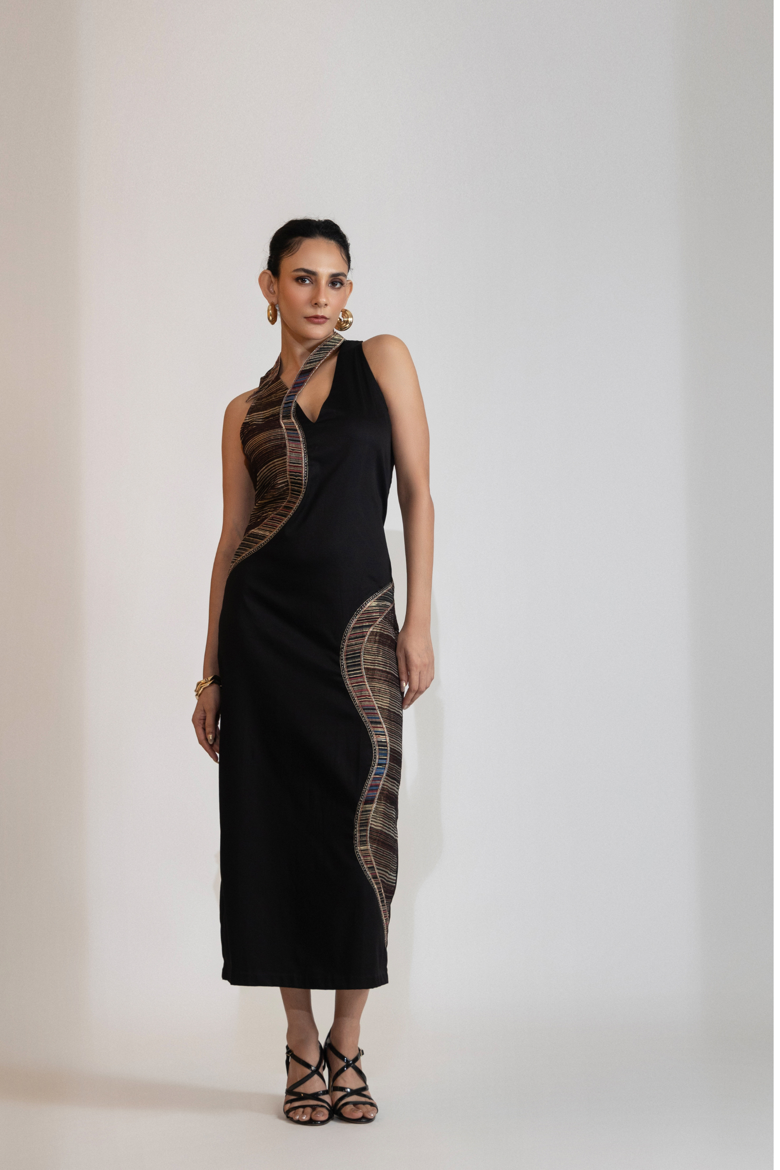A black fitted dress with colorful handwoven zari stripes on the sides. The stripes have shiny