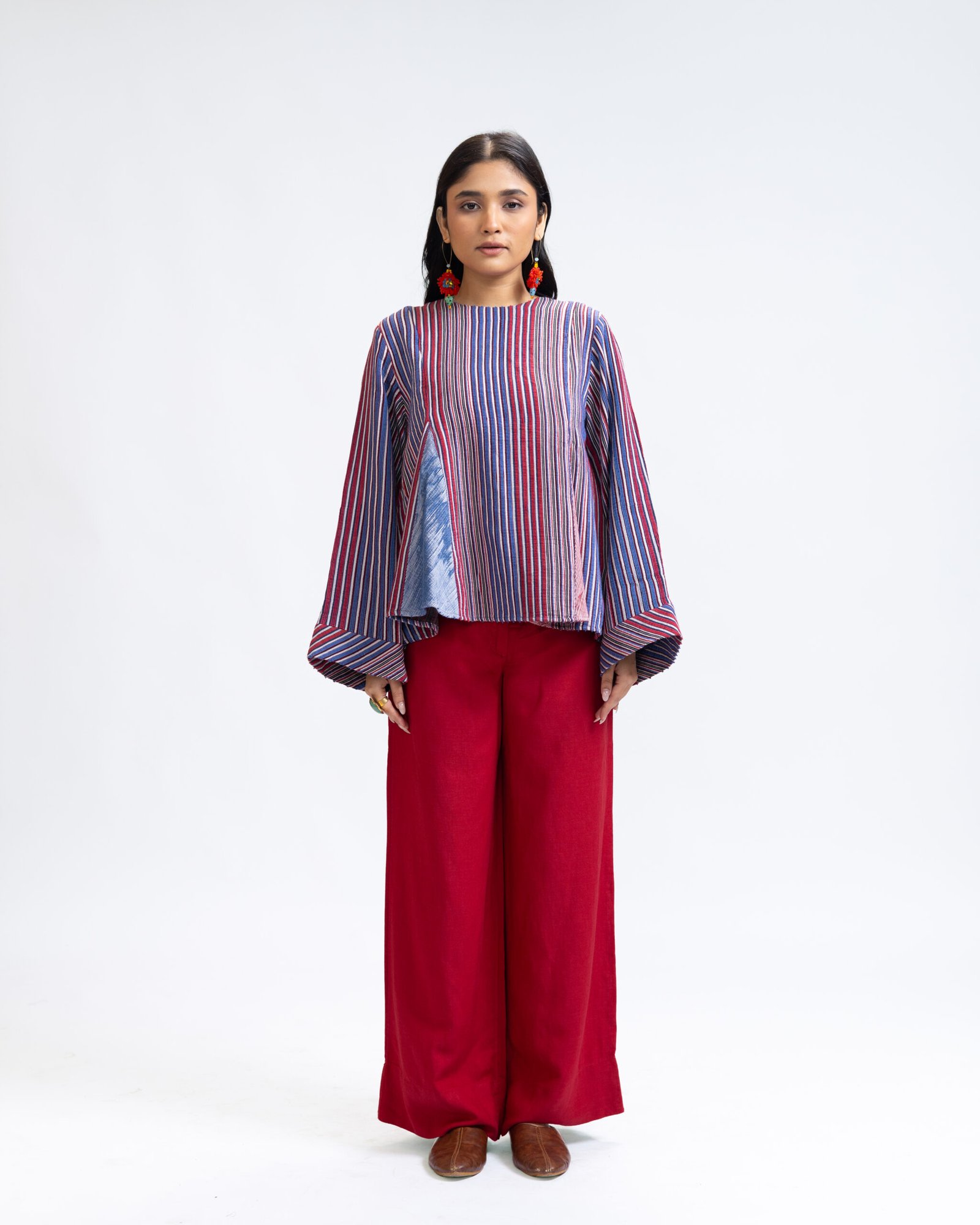 ₹11,600.00This ready to wear peplum top has been designed with cotton, silk and lycra. This is a one-piece woven garment not cut and sewn which makes it truly unique. The square neckline, full sleeves that are relaxed and some waist cinching that flares out for an easy fit.