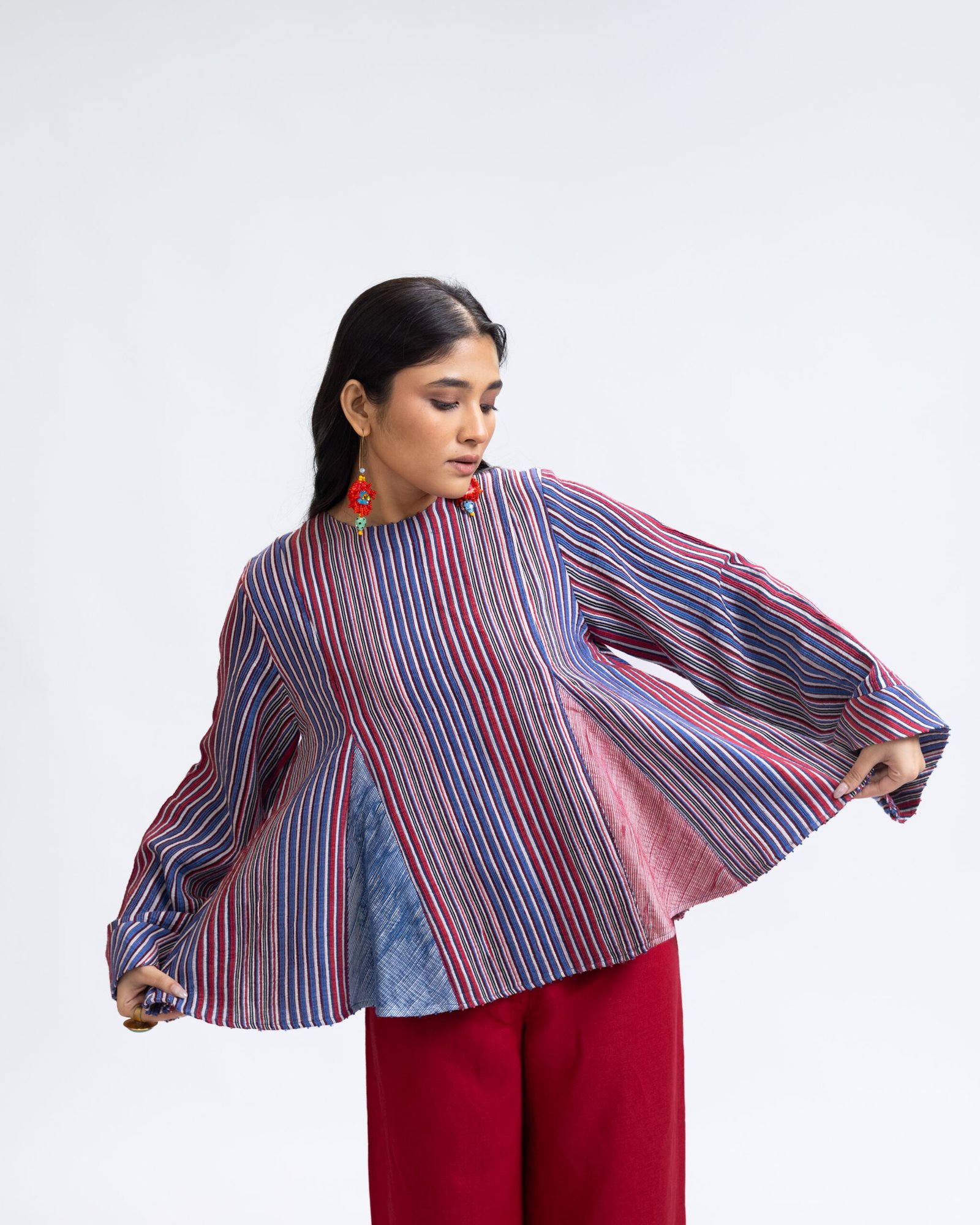 ₹8,300.00This ready to wear peplum top has been designed with cotton, silk and lycra. This is a one-piece woven garment not cut and sewn which makes it truly unique. The square neckline, full sleeves that are relaxed and some waist cinching that flares out for an easy fit.