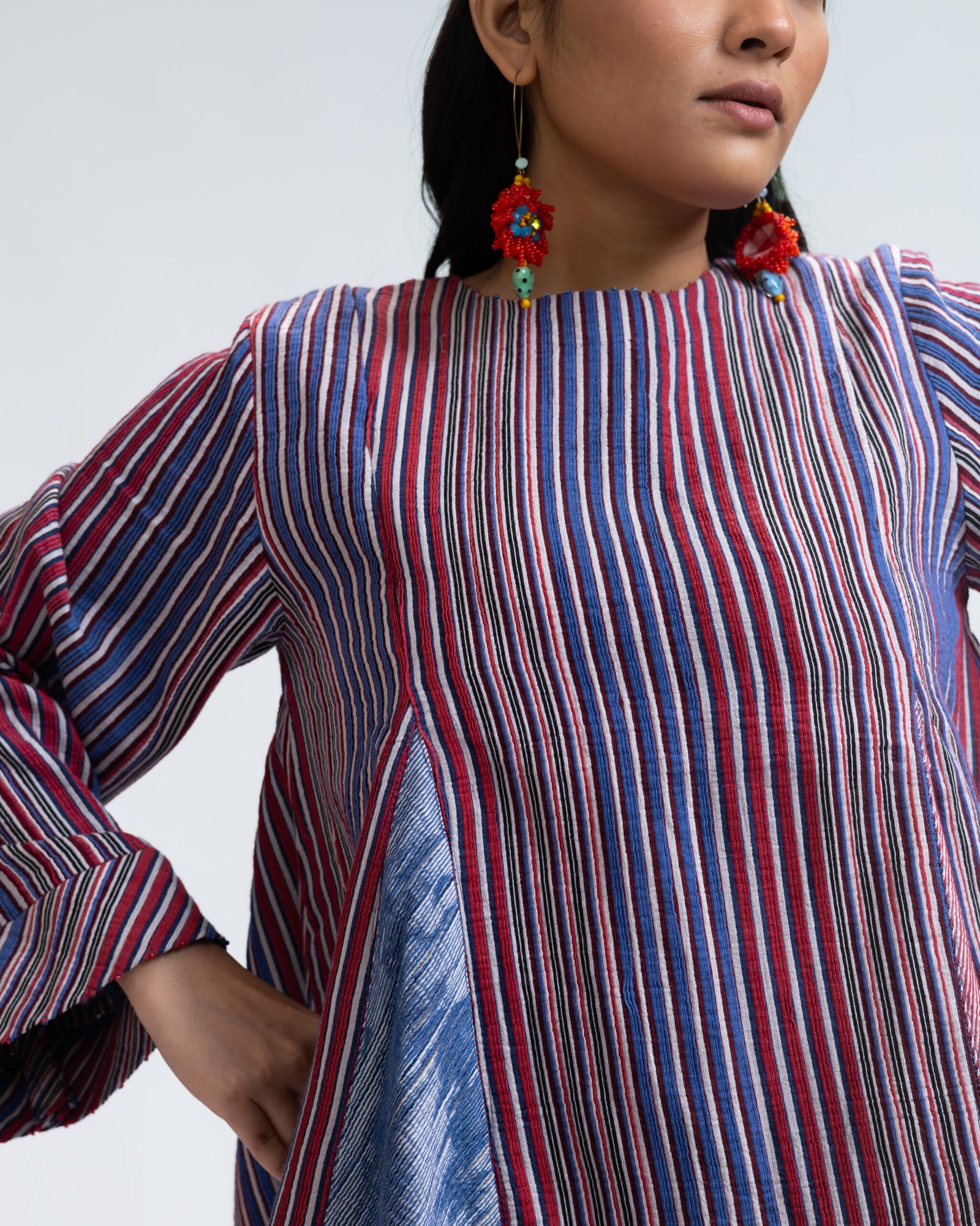 ₹9,000.00A relaxed-fit ready to wear midi dress featuring bold, multi-directional stripes on a soft blue base. The asymmetrical panelling and round neckline give it a modern twist, there is red kantha and cross stitch detailing across the piece.