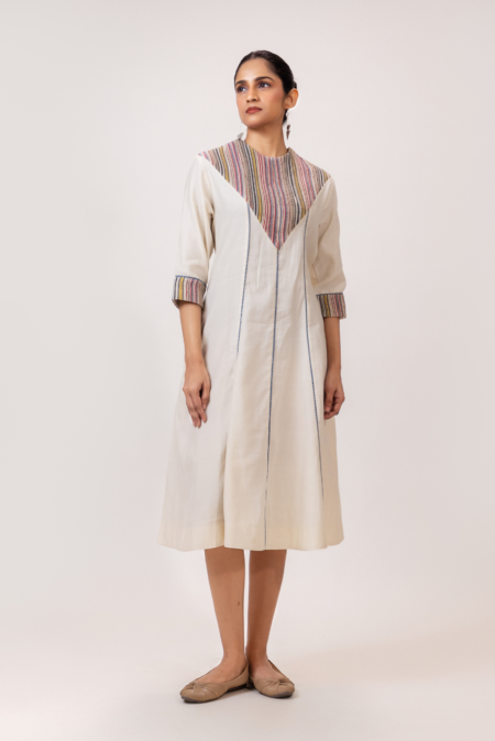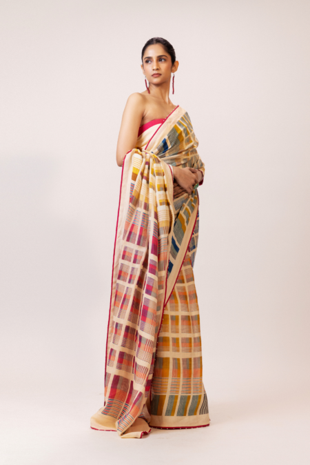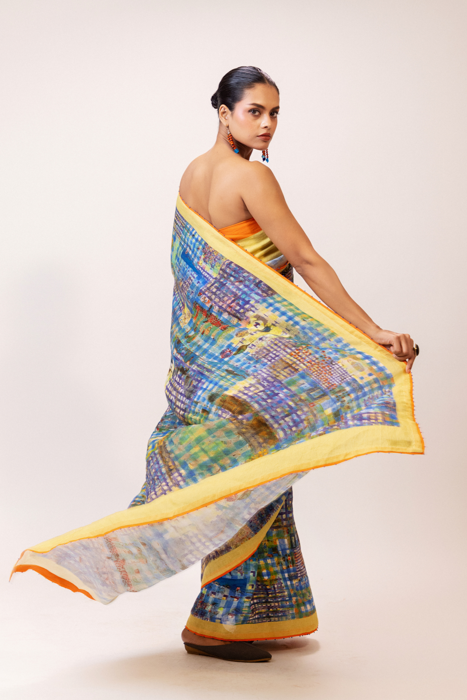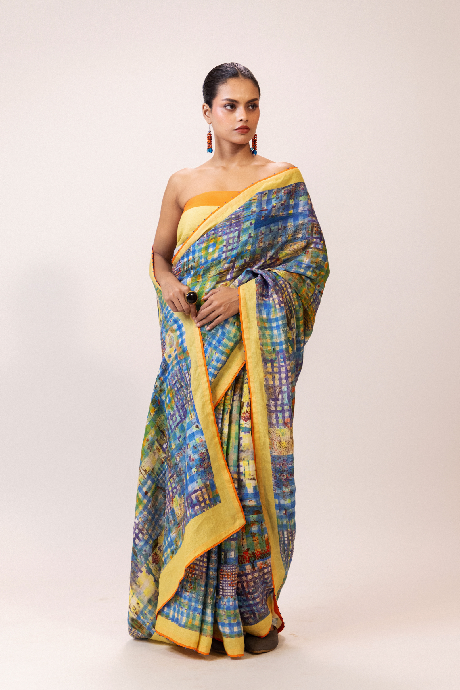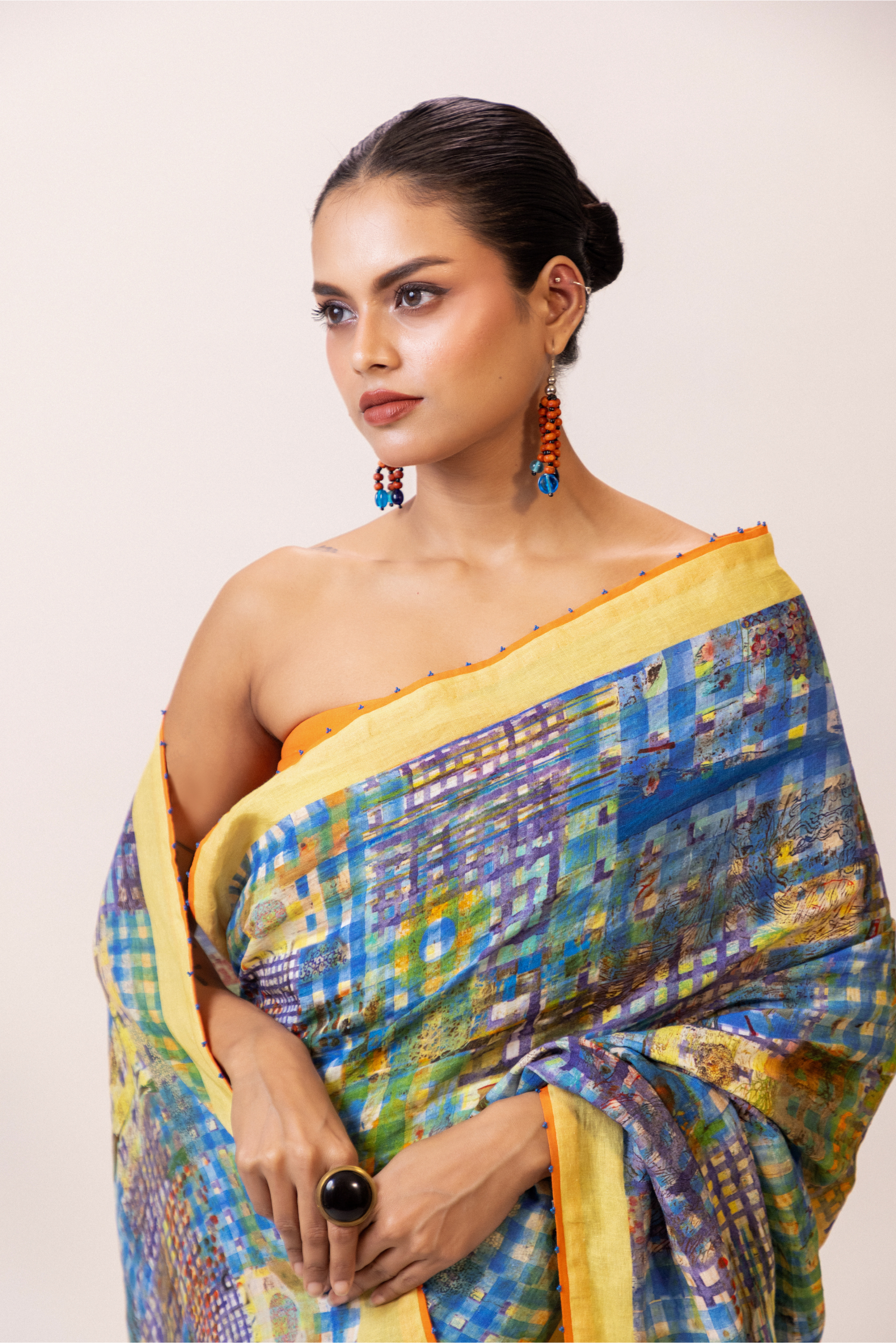 A vibrant fusion of colour and texture, this 100% linen saree features an abstract mosaic print in rich blues and greens, framed with a striking orange and yellow border. Delicate bead detailing along the edges adds a subtle handcrafted finish, enhancing its artistic appeal. Light, breathable, and fluid in drape.